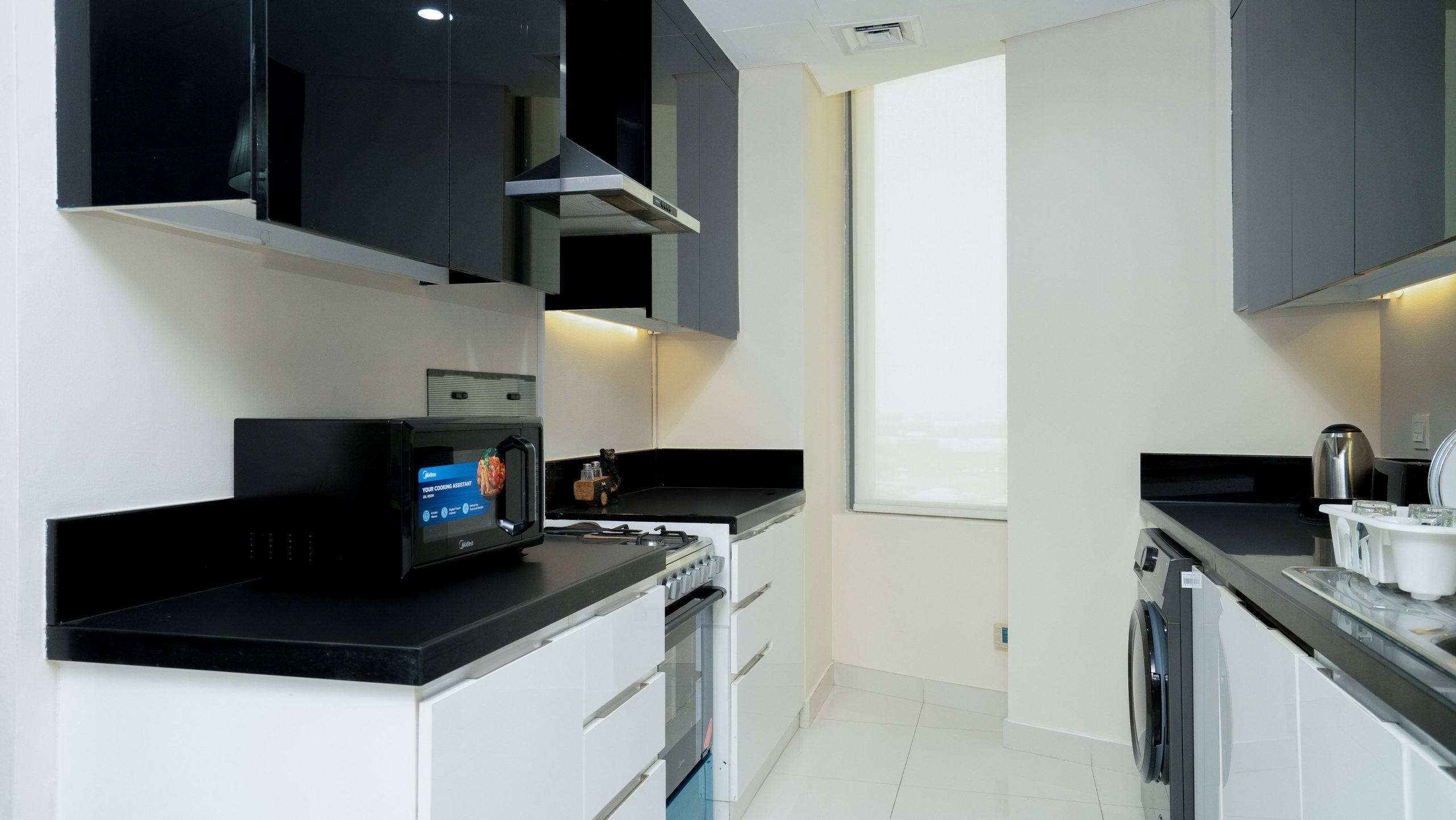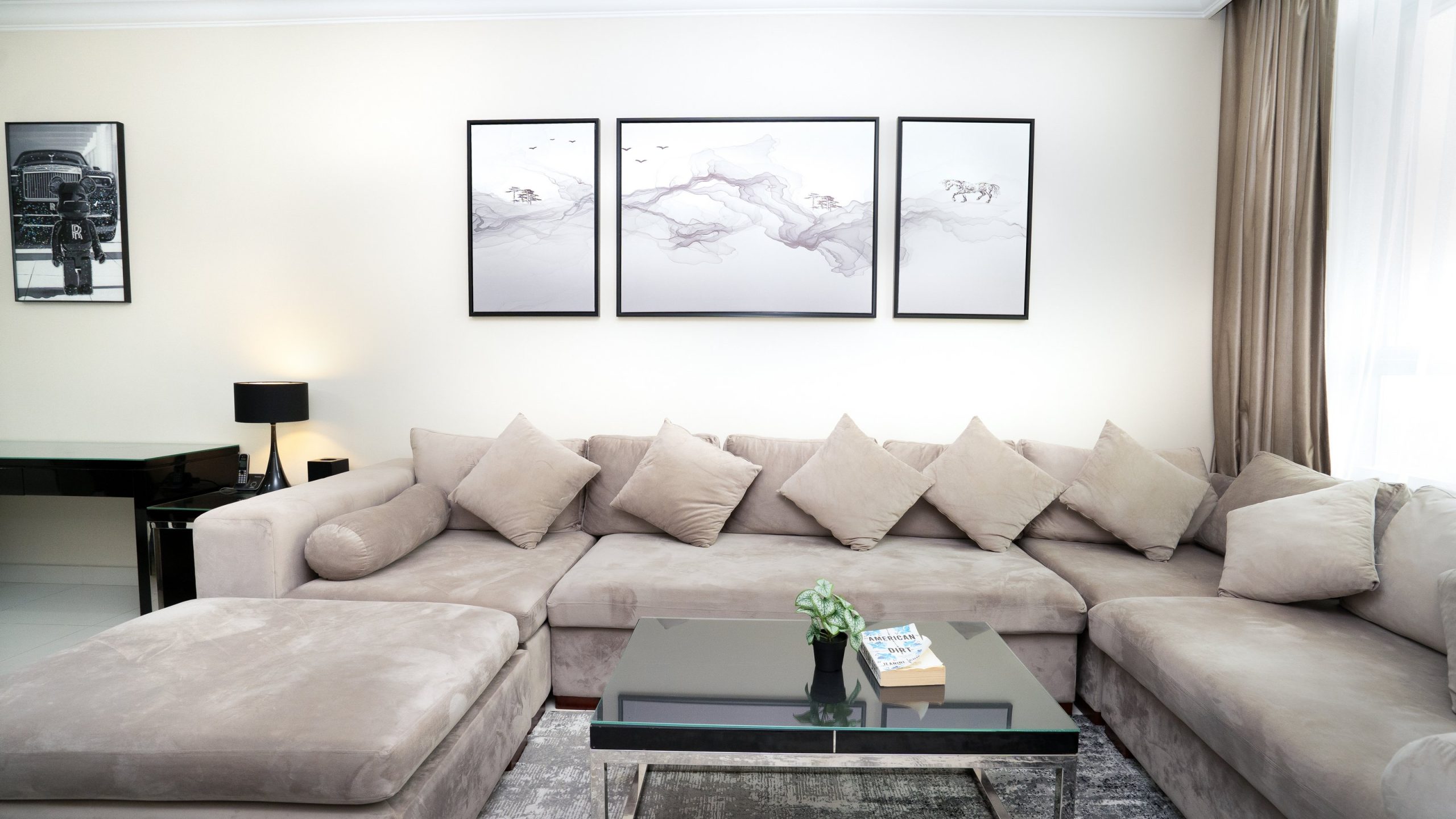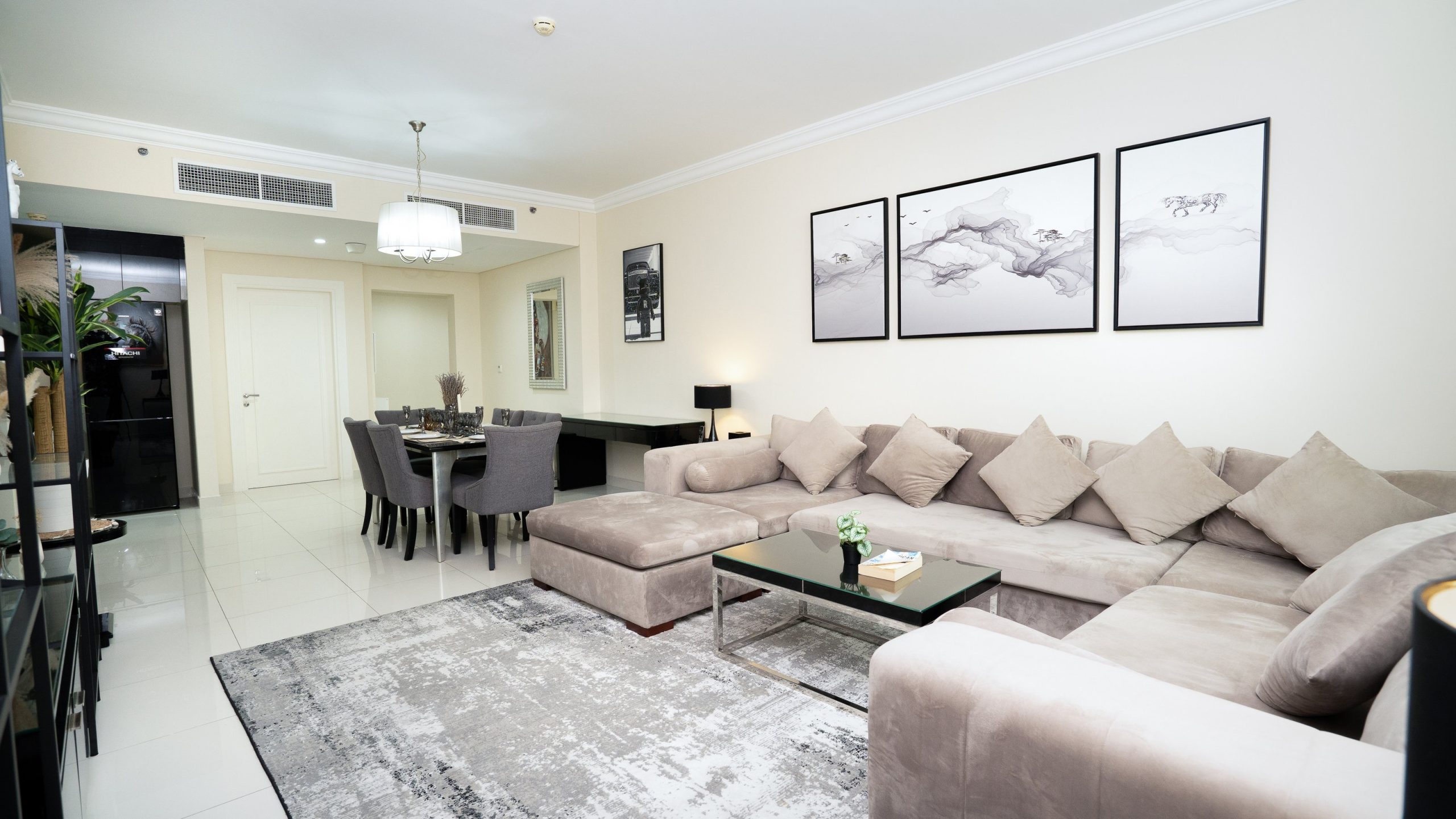 Step inside to discover a spacious, contemporary living area featuring sleek, high-end finishes and chic décor. The open-plan layout seamlessly connects the living room, dining area, and fully equipped kitchen — ideal for both relaxation and entertaining guests.