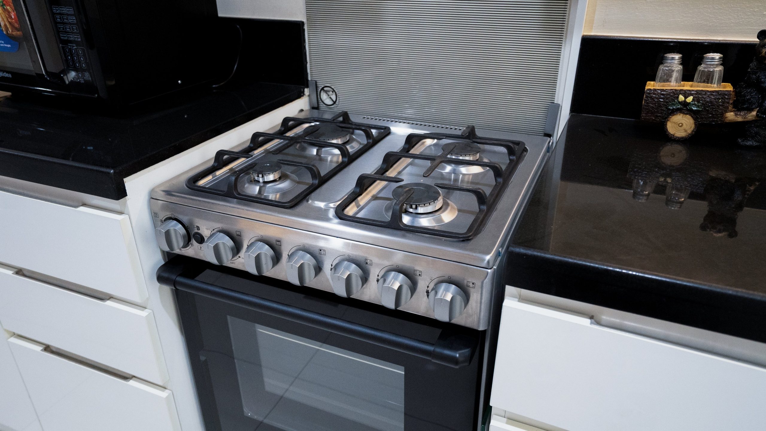 The fully equipped kitchen boasts high-end stainless steel appliances including a refrigerator, oven, stovetop, microwave, and dishwasher. Whether preparing a quick breakfast or a gourmet dinner, you’ll find all the necessary cookware, utensils, and dinnerware at your disposal. The adjacent dining area comfortably seats four, perfect for family meals or entertaining guests.