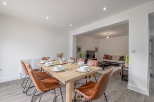 The cosy lounge area offers a perfect space to unwind, complete with a Smart TV and a large, comfortable sofa. High-speed Wi-Fi is available throughout the house, ensuring you stay connected during your stay.