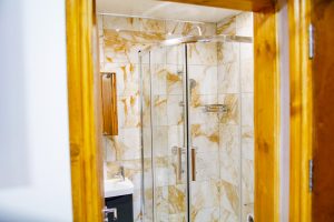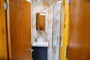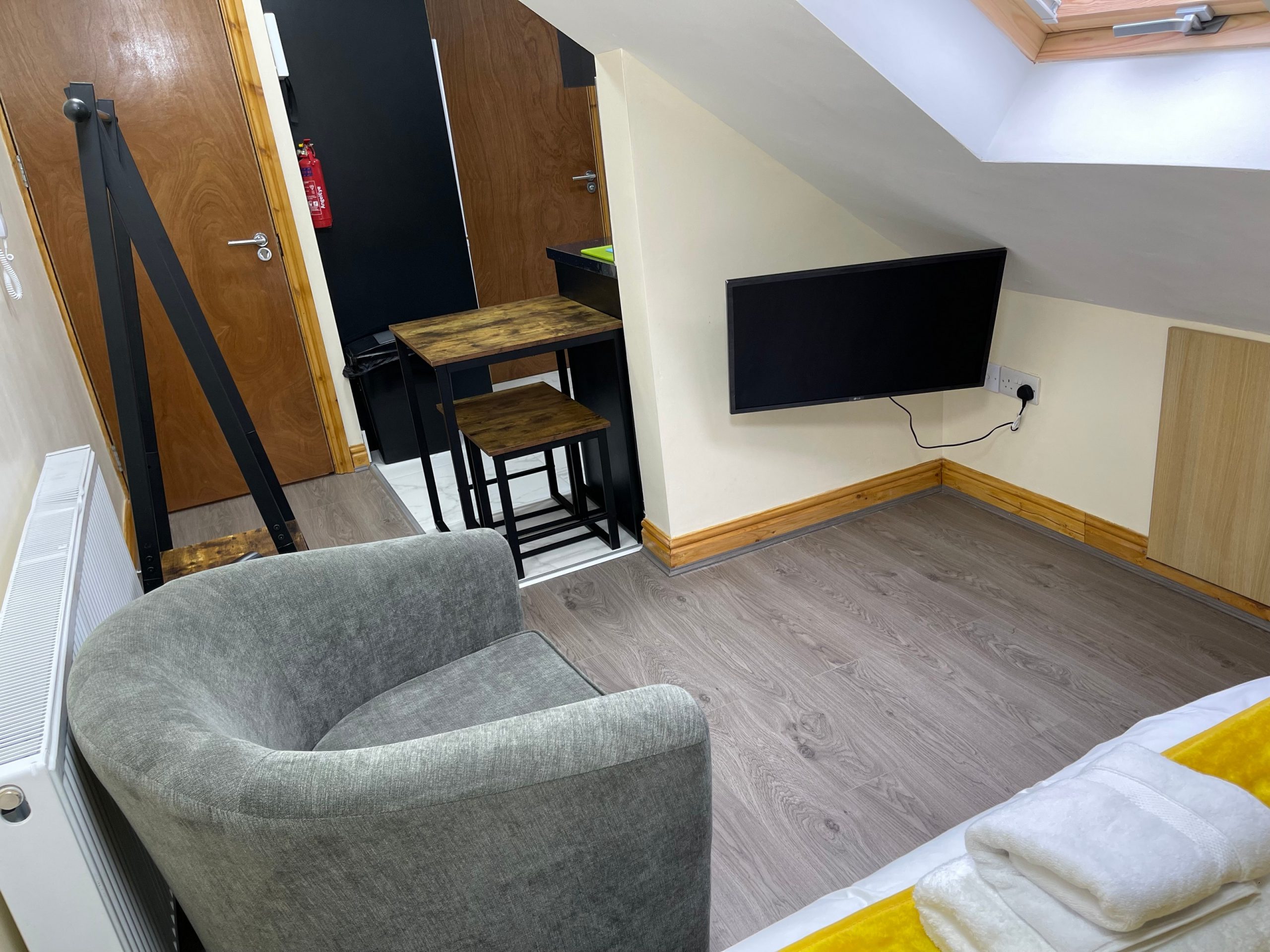 There is a smart TV in the sitting area and high speed internet. Please note the ceiling in the bedroom area is very sloped.