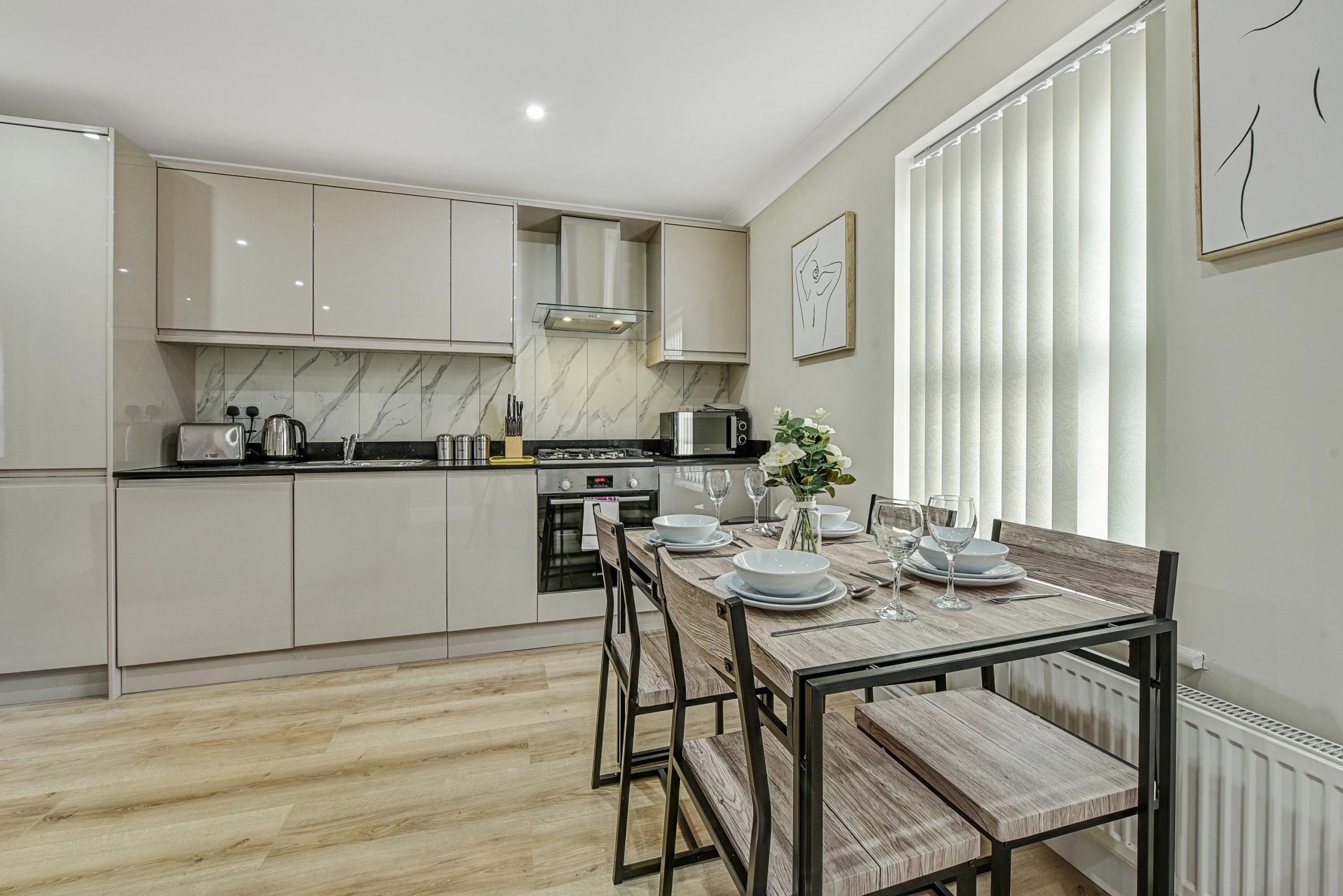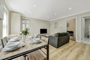 Deanway Serviced Apartment A in Chalfont St Giles is a one bedroom apartment with free, secure parking and Wi-Fi. The living room has comfortable seating including a sofa bed, plus a dining area with table and chairs.