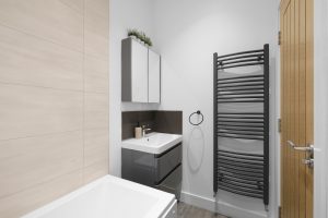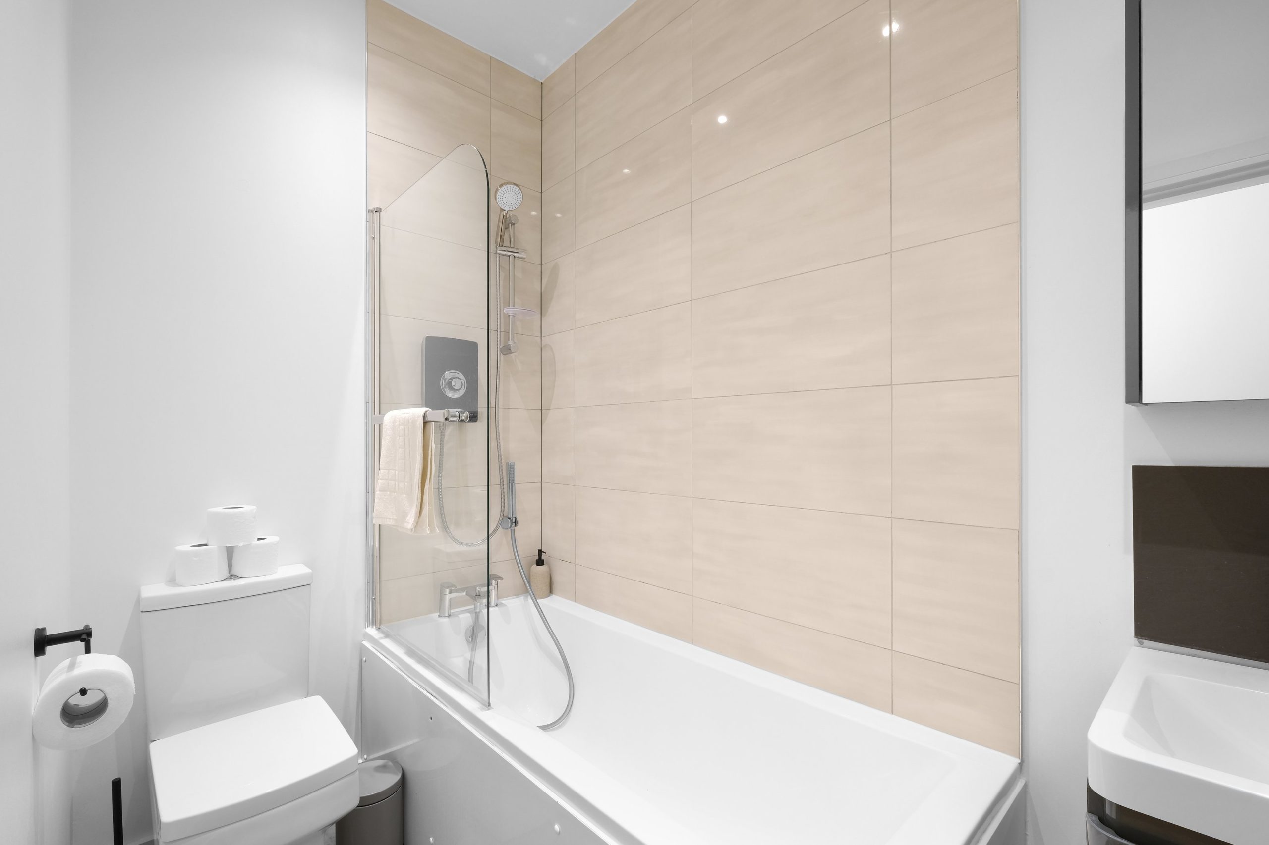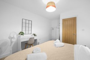 The bedroom is thoughtfully designed for rest and convenience, featuring a cosy super king bed and practical storage solutions to keep your stay organized. The modern bathroom is clean and functional, fitted with a shower and all the essentials for your comfort.