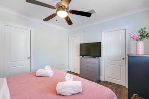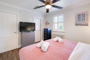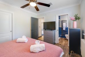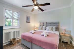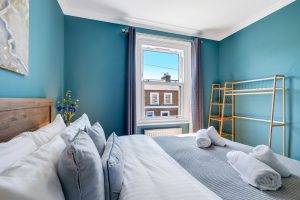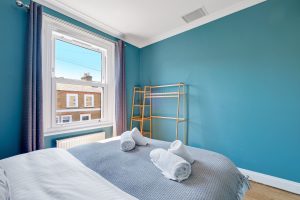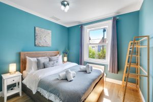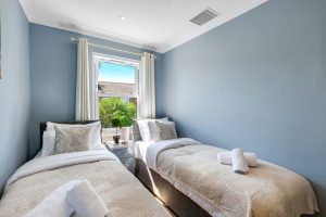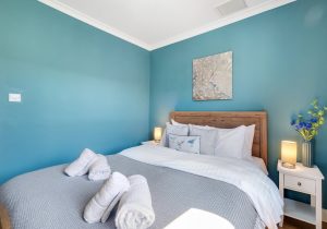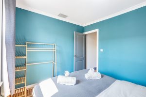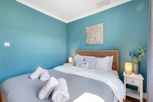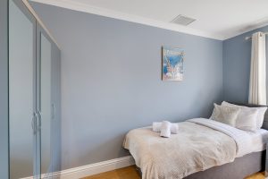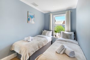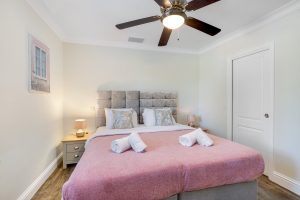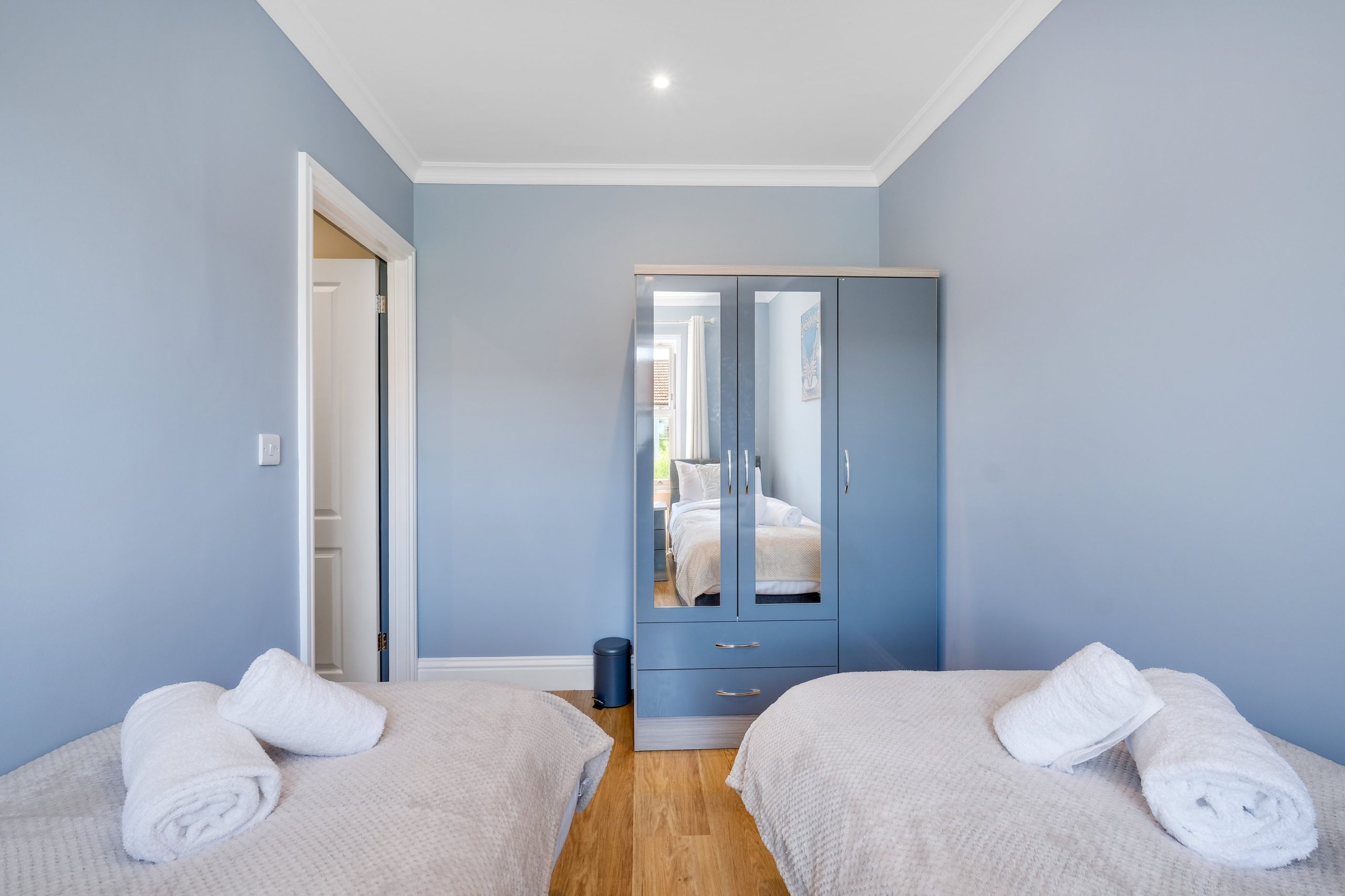 Each of the three bedrooms is thoughtfully designed to provide comfort and tranquility. The master bedroom features a plush double bed, ample storage, and a private ensuite bathroom fitted with contemporary fixtures. The additional bedrooms are equally inviting, furnished with premium linens and decor to ensure a restful stay for every guest.