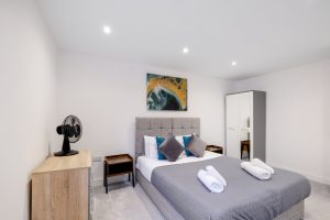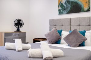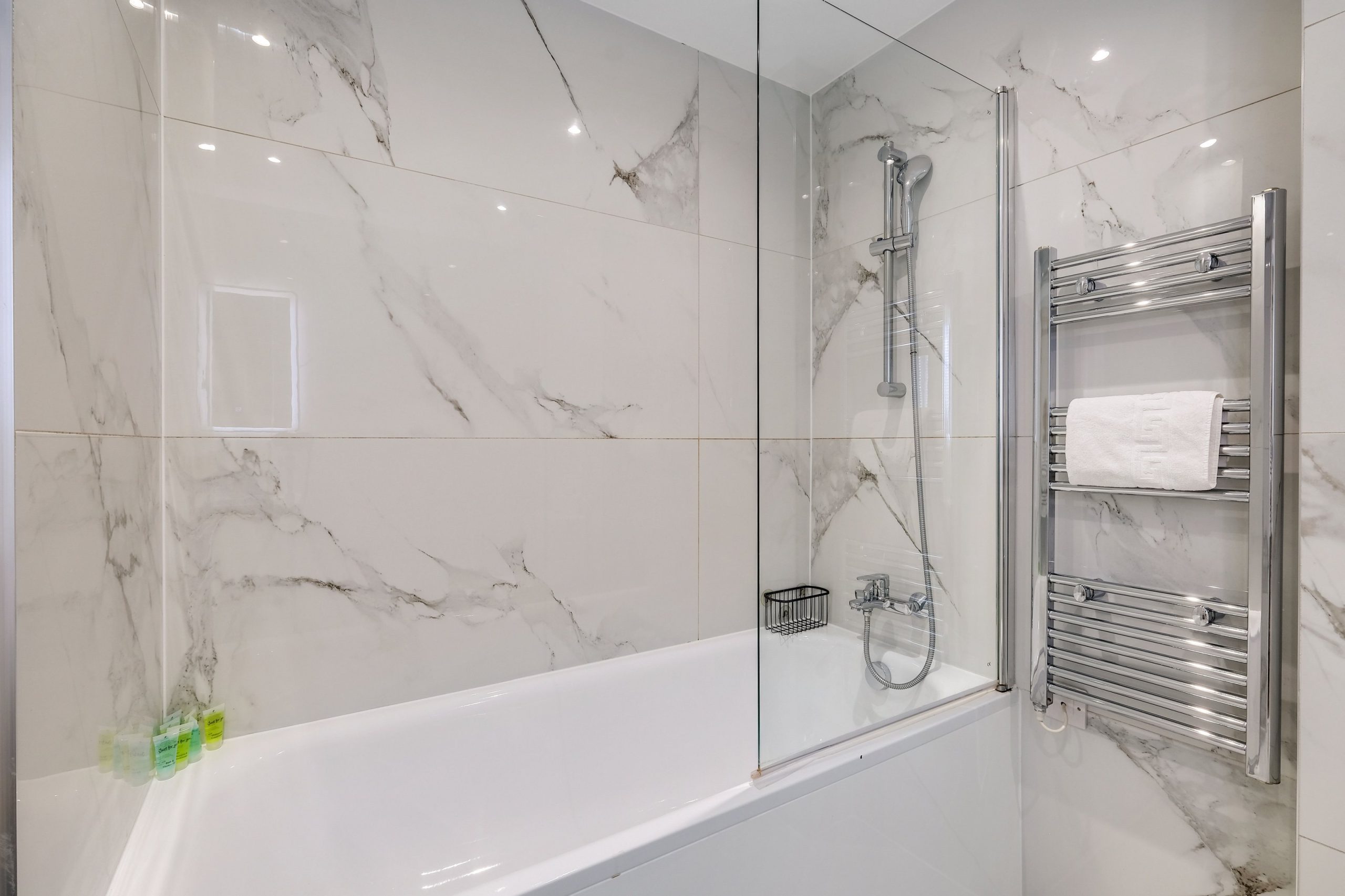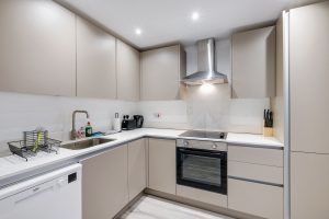 Newly refurbished 1 bedroom apartment with a light and spacious feel, the fully equipped kitchen, lounge, and dining area with a four seater dining table will guarantee you a comfortable stay, with Smart TV and free Wi-Fi. The meticulously designed one bedroom presents a king size bed where you can kick back relax and enjoy a well-deserved restful night’s sleep after a long day. This modern apartment also includes a family bathroom with a bath and a shower over. The kitchen is fully equipped with all the utensils you require to make a meal or a snack along with a washing machine and dishwasher. The roof terrace garden has a spacious relaxing area ideal for you to enjoy in the summer months.