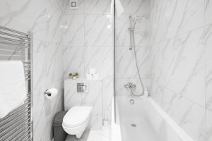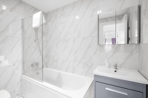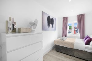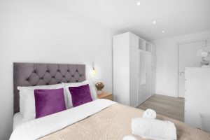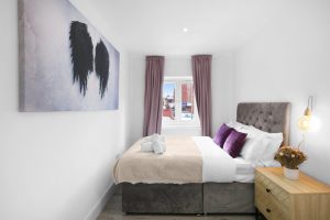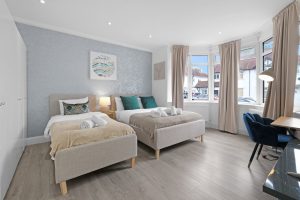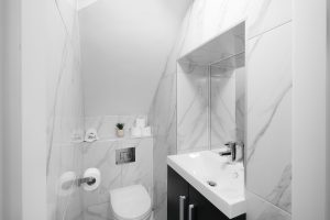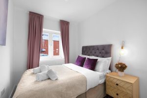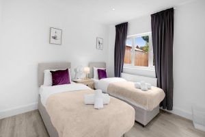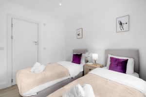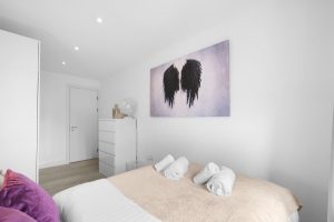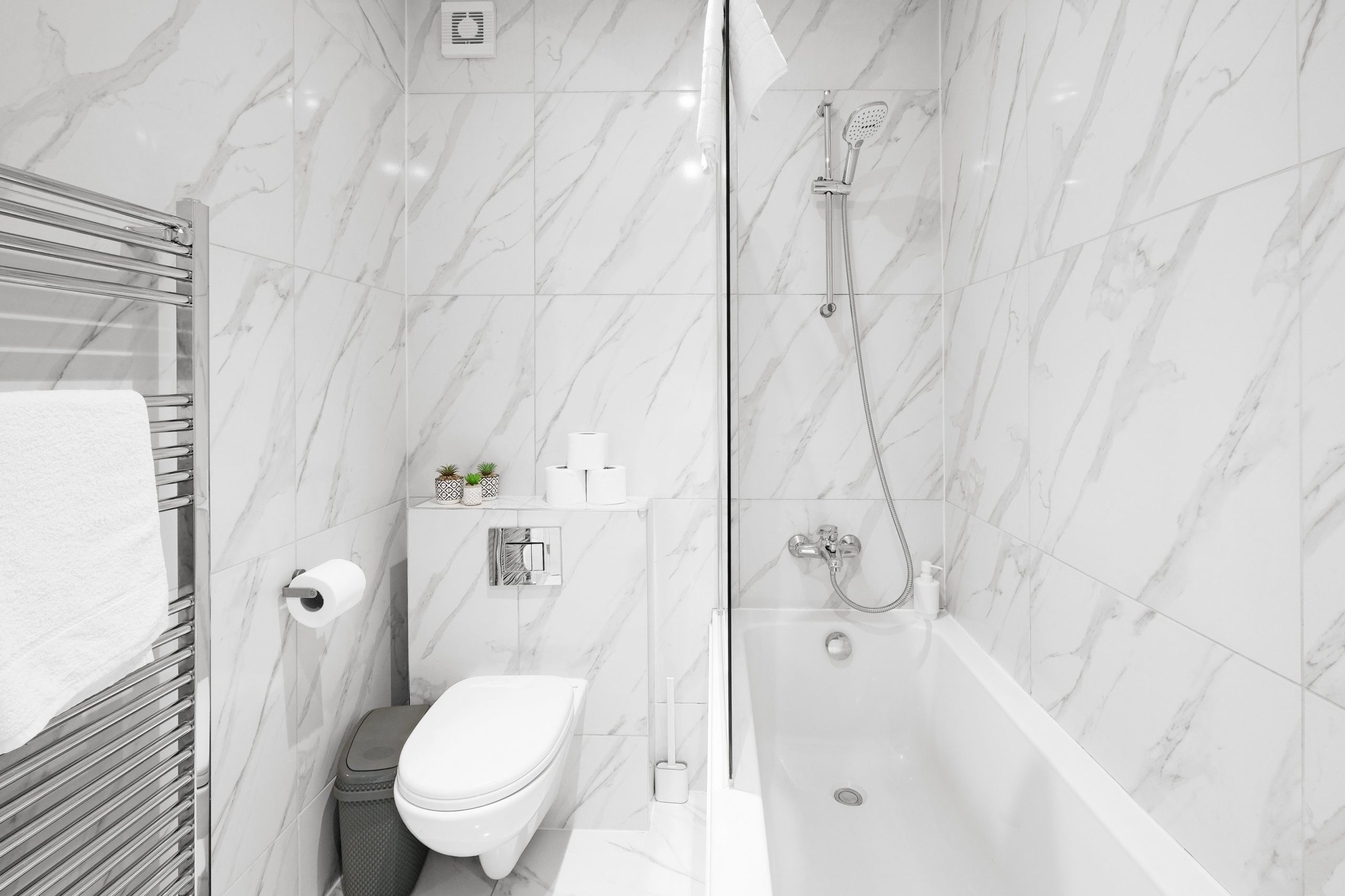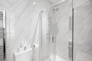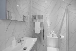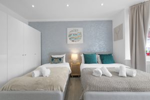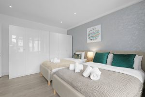 The flat boasts three generously sized bedrooms, each decorated with calming tones, high-quality bedding, and ample wardrobe space to ensure a restful stay. The master bedroom features a comfortable double bed and an en-suite bathroom, offering added privacy and ease. The remaining two bedrooms are perfect for guests or family members, with flexible sleeping arrangements to suit your needs.