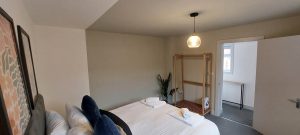 The tranquil bedroom offers a peaceful retreat, complete with a comfortable bed, soft linens, and hanging space.