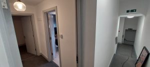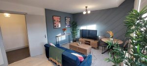 Upon entering the apartment, you’re greeted by a warm and inviting living space. The open-concept layout seamlessly connects the living area with the kitchen. The living area is thoughtfully designed with comfortable seating and stylish décor, providing the perfect space to relax and unwind after a long day. The well-appointed kitchen, features modern appliances, ample storage, and sleek countertop.
