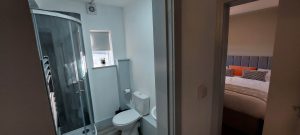 The tranquil bedroom offers a peaceful retreat, complete with a comfortable double bed with soft linens; complete with hanging space.