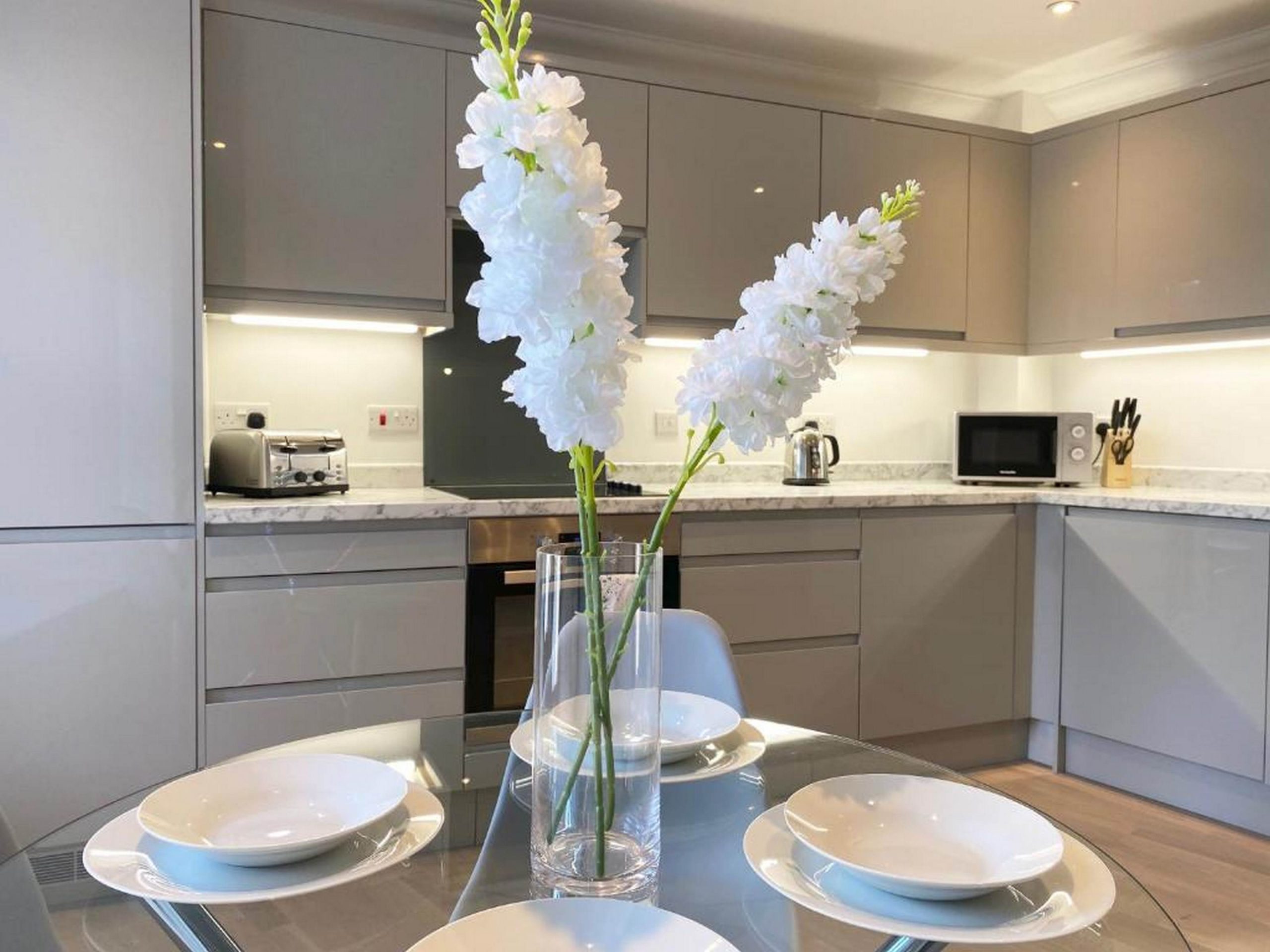 Presenting this 2 Bedroom modern Apartment in Rochester. This exquisite apartment comprises two bedrooms, one of which includes an en-suite bathroom, and also a family bathroom. The living room is furnished with comfortable seating, including a dining area with a table and chairs. For entertainment needs, we offer a Smart TV with internet connectivity, allowing you to easily access your Netflix and other streaming services. The kitchen is fully equipped, complete with a Fridge/Freezer, Microwave, Kettle, Toaster and Dishwasher, plus all necessary utensils and crockery. As for sleeping arrangements, the primary bedroom boasts a king size bed and bedside tables. Similarly, the second bedroom is outfitted with a king bed, along with a clothes rail and bedside tables. The main bathroom is thoughtfully arranged with a shower over a bath, accompanied by a sink and toilet. Notably, the master bedroom enjoys the convenience of an en-suite bathroom. The accommodation is fully equipped for your convenience and comfort. A standard stay includes weekly changes of linen and towels, while mid-stay cleaning services are available for an additional fee.