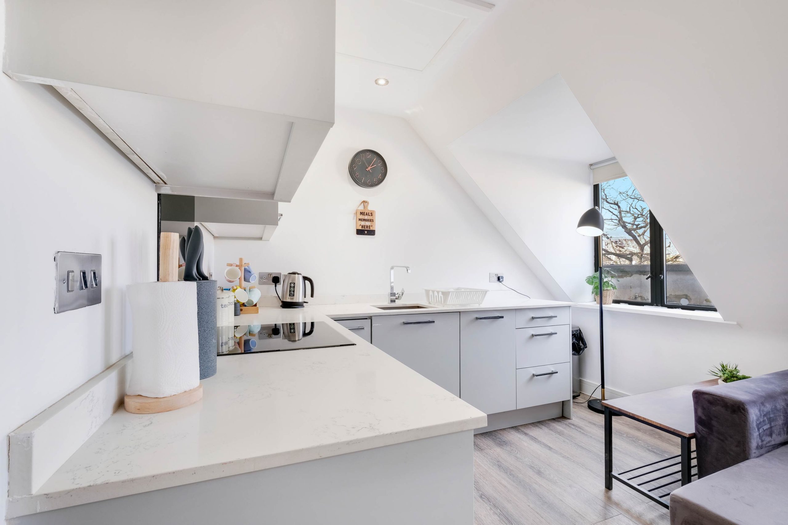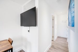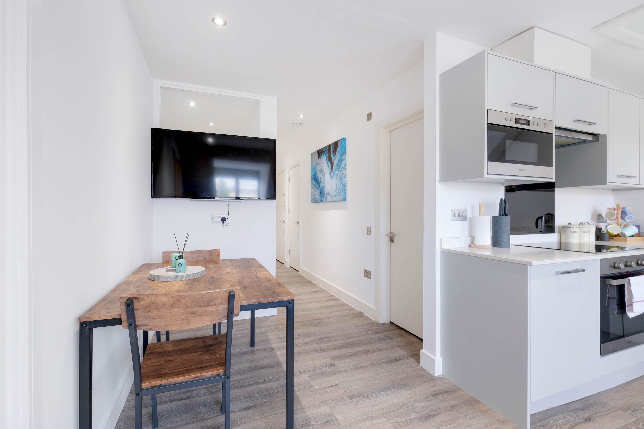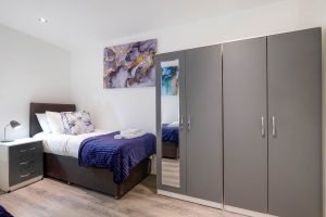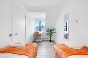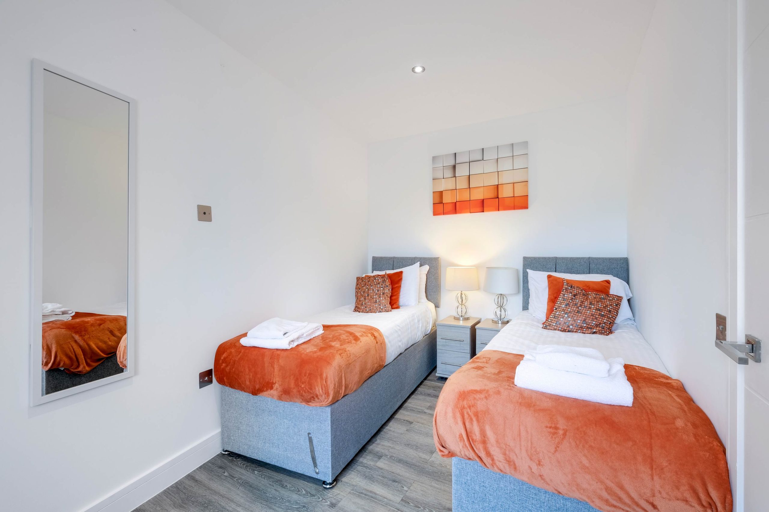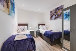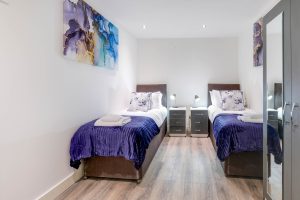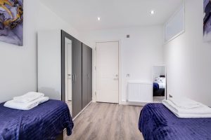 Reading Town Centre Two Bedroom Apartment with Parking by 360Stays is located less than 10 minutes walk to the town centre and a 15-minute walk to the reading train station. Located on the third floor, The apartment comes fully furnished for a short or long-term stay. Offering a super king bed and 2 single beds for a comfortable sleep. The open plan lounge & Kitchen/Diner offers a 2.5-seat sofa bed with an armchair providing plenty of seating and a 2-seat dining table. The apartment has a 43″ smart TV and super fast broadband. The fully equipped kitchen allows you to cook a full meal or prepare a small snack. The bedroom has plenty of storage, a double wardrobe, and 2 bedside tables. So whether you are staying for a few nights or a few months then look no further and book now.
