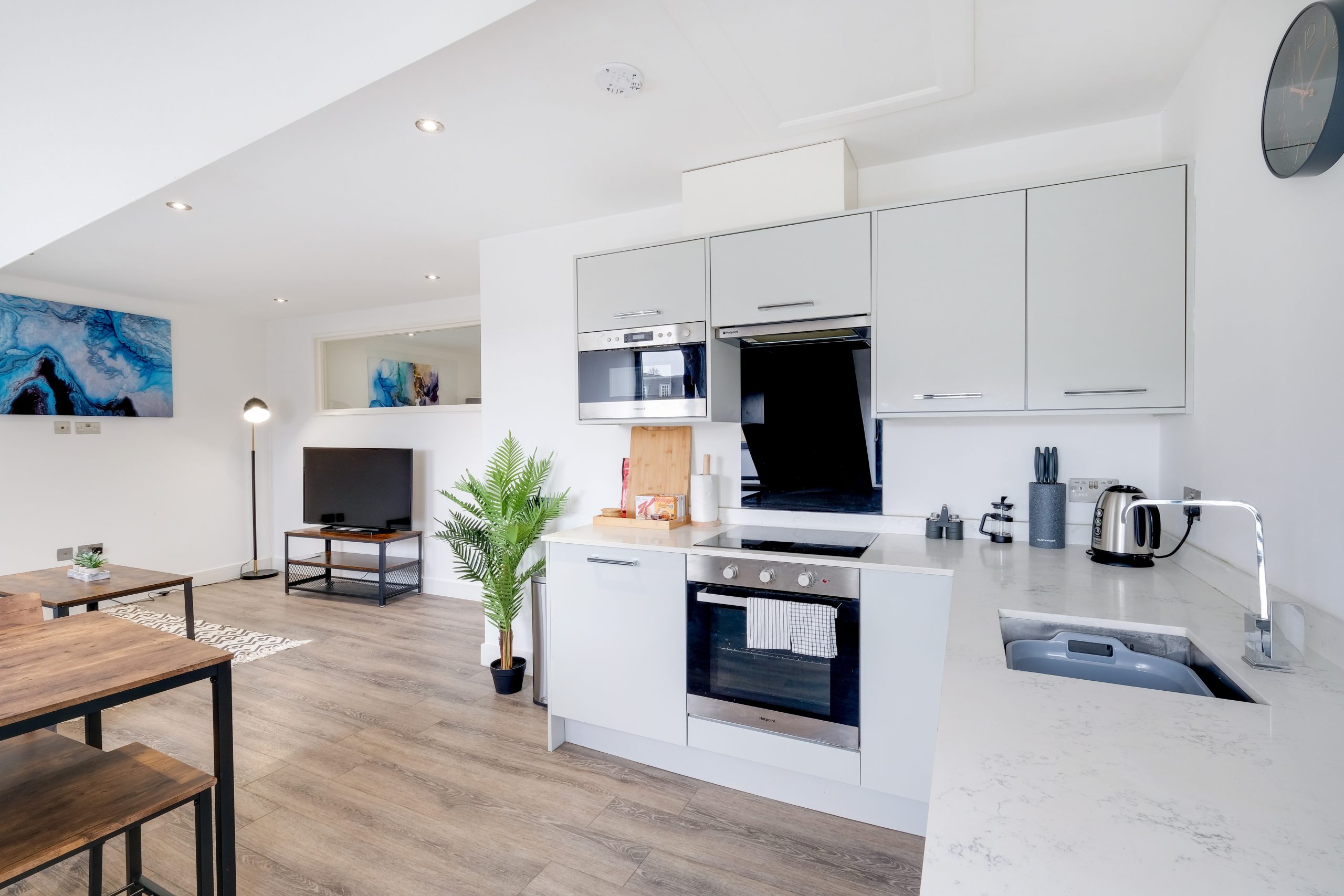 Reading Town Centre Two Bedroom Apartment with Parking by 360Stays is located less than 10 minutes walk to the town centre and a 15-minute walk to the reading train station. Located on the third floor, The apartment comes fully furnished for a short or long-term stay. Offering a super king bed and 2 single beds for a comfortable sleep. The open plan lounge & Kitchen/Diner offers a 2.5-seat sofa bed with an armchair providing plenty of seating and a 2-seat dining table. The apartment has a 43″ smart TV and super fast broadband. The fully equipped kitchen allows you to cook a full meal or prepare a small snack. The bedroom has plenty of storage, a double wardrobe, and 2 bedside tables. So whether you are staying for a few nights or a few months then look no further and book now.
