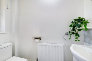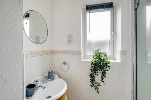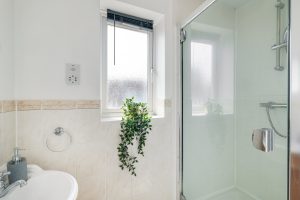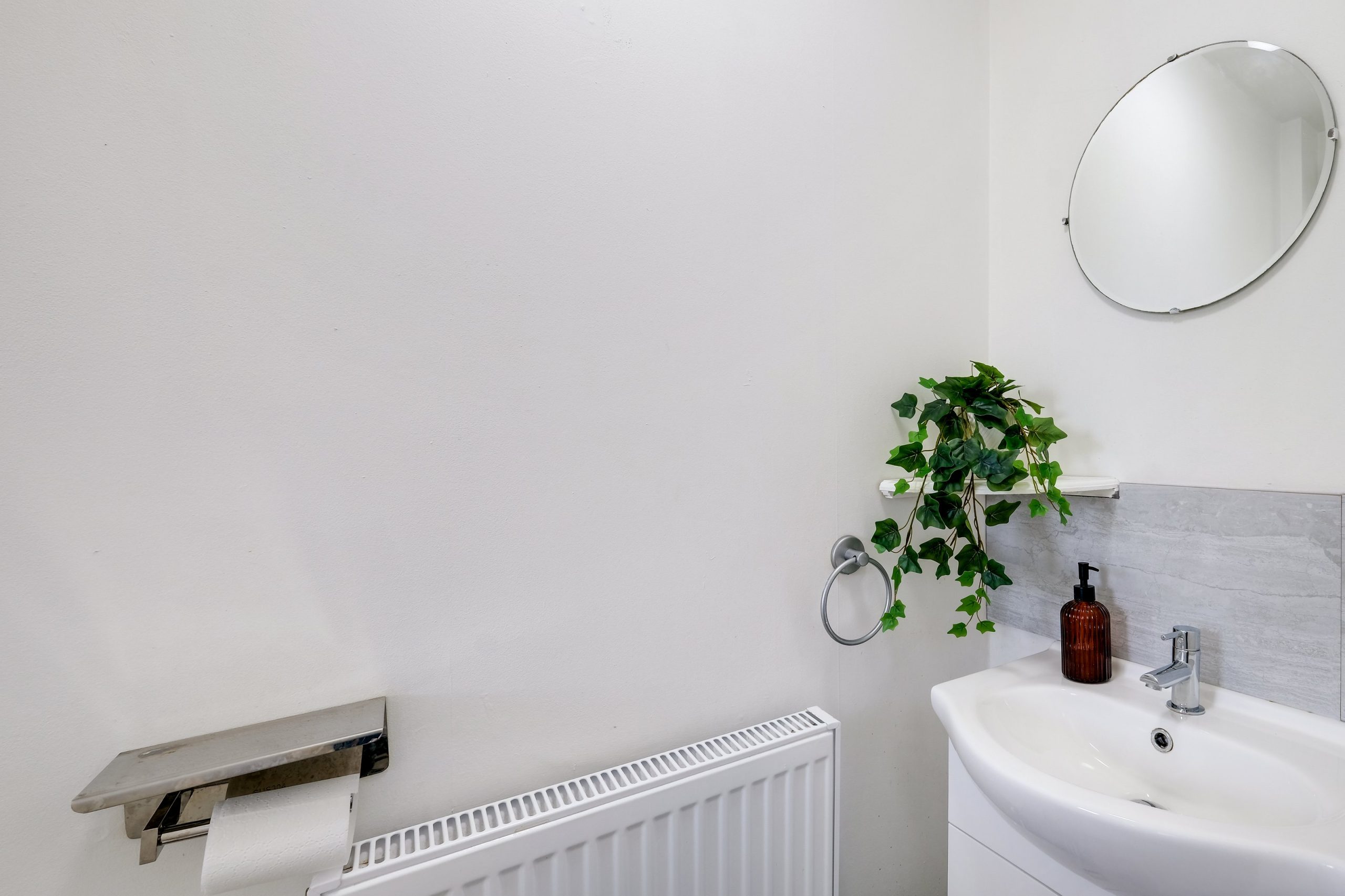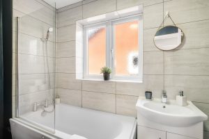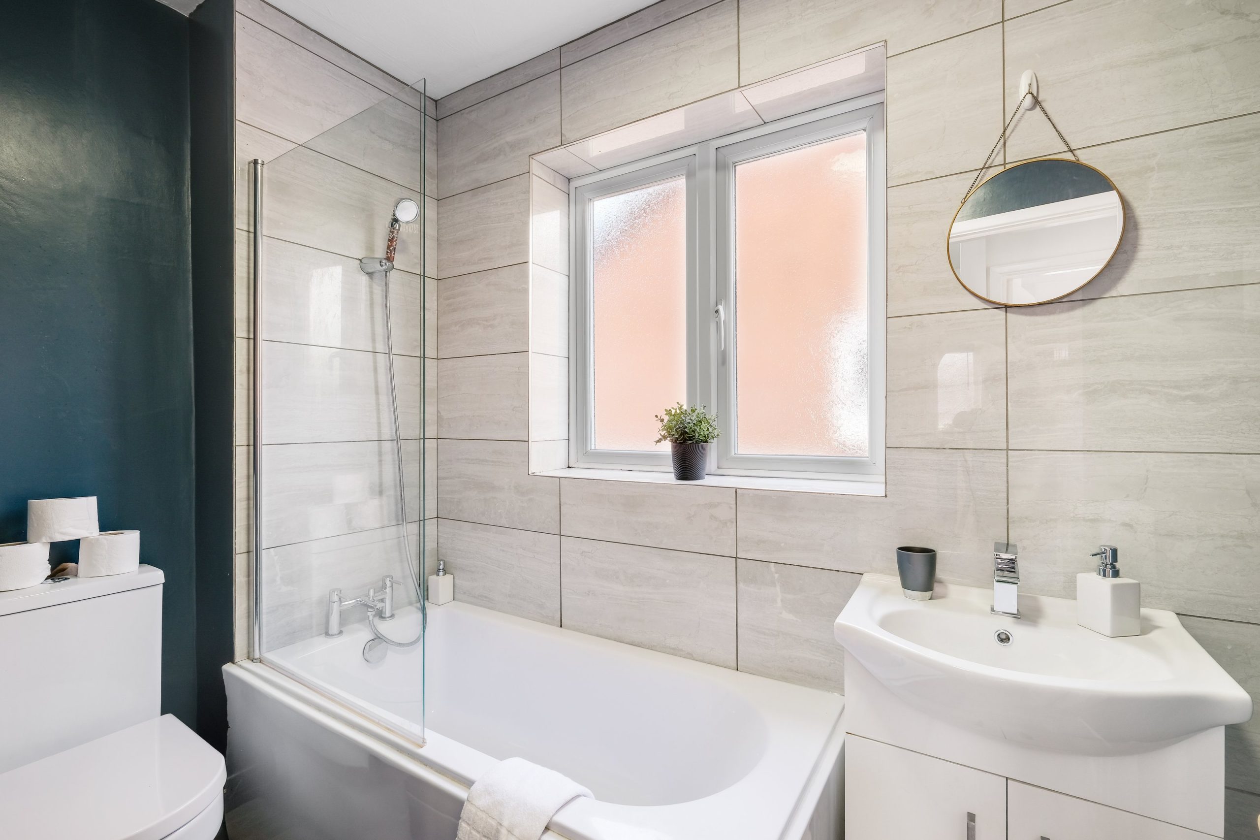 The home features four generously sized bedrooms, including a main bedroom with a modern en suite shower room. A well-appointed family bathroom with a full-size bath and overhead shower serves the additional bedrooms, offering plenty of space for guests or larger households.