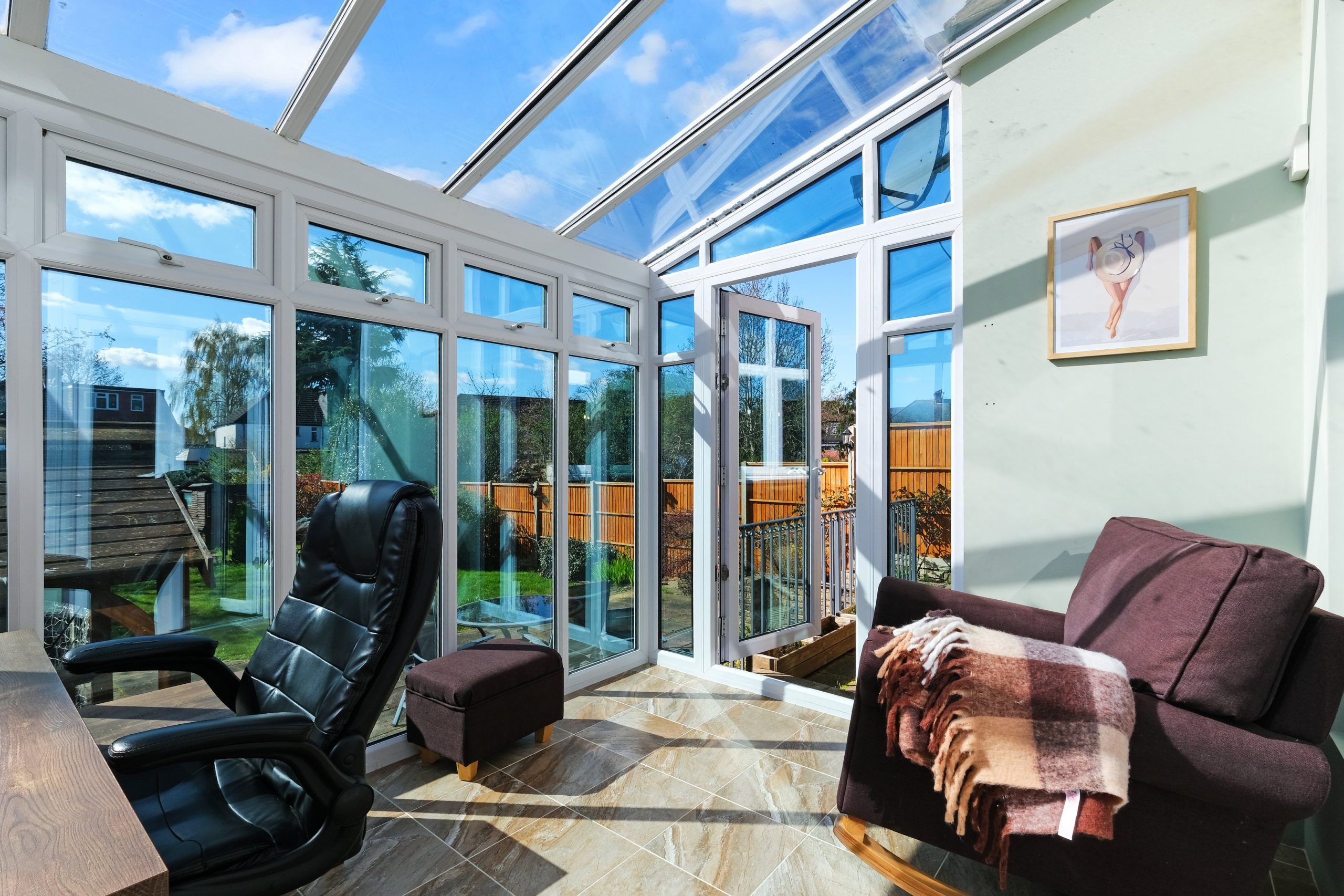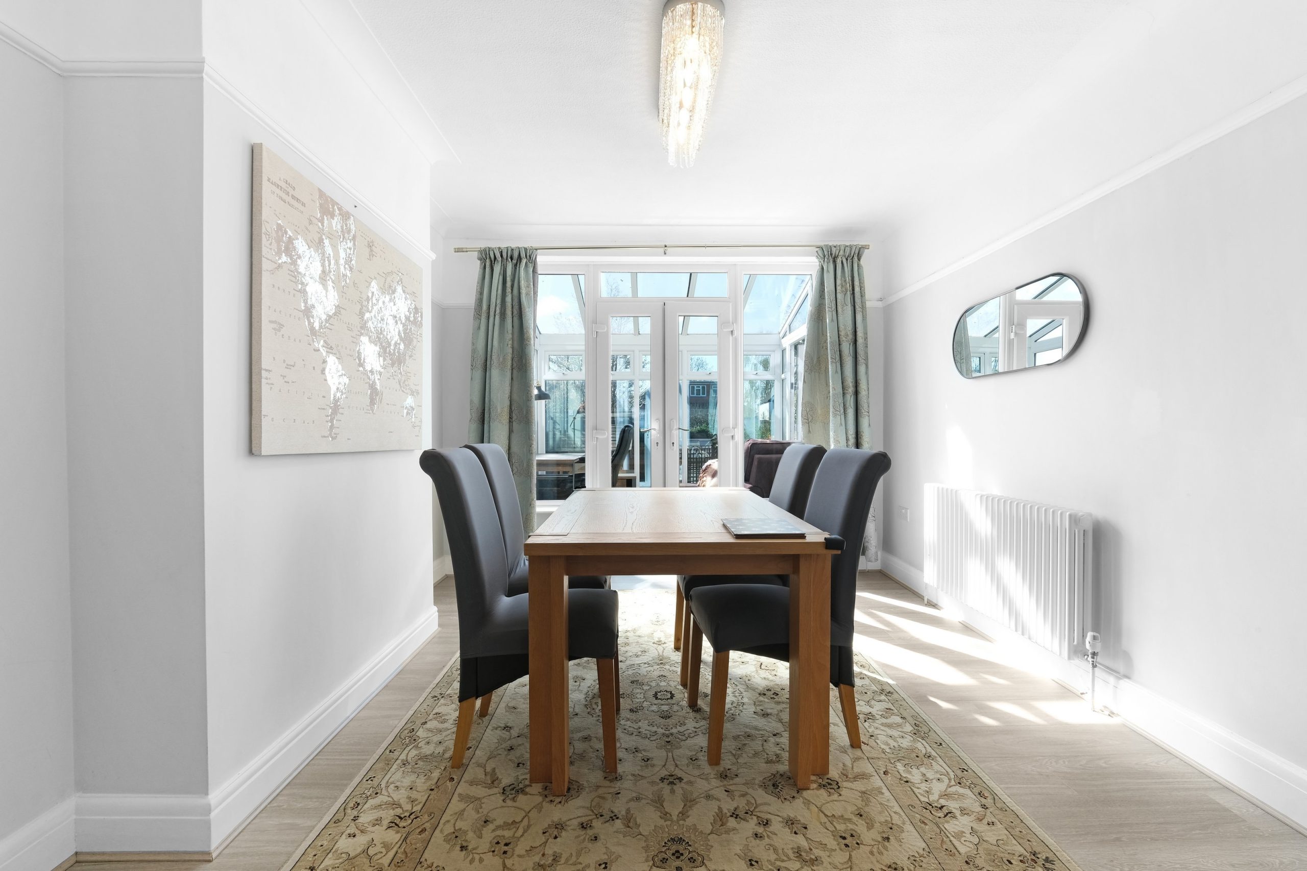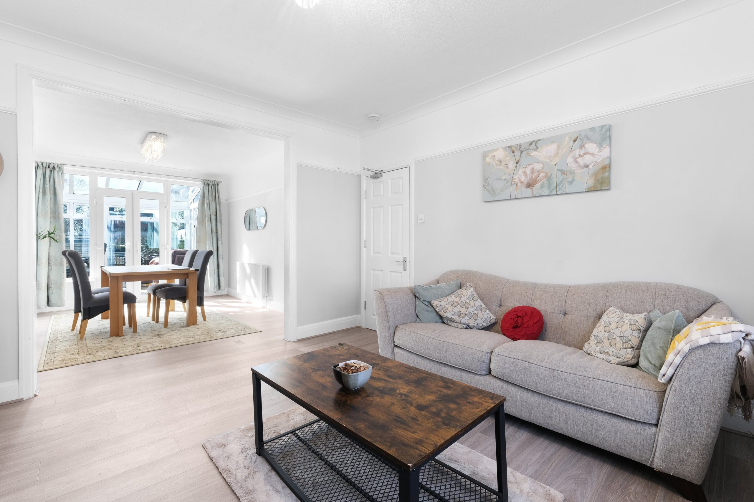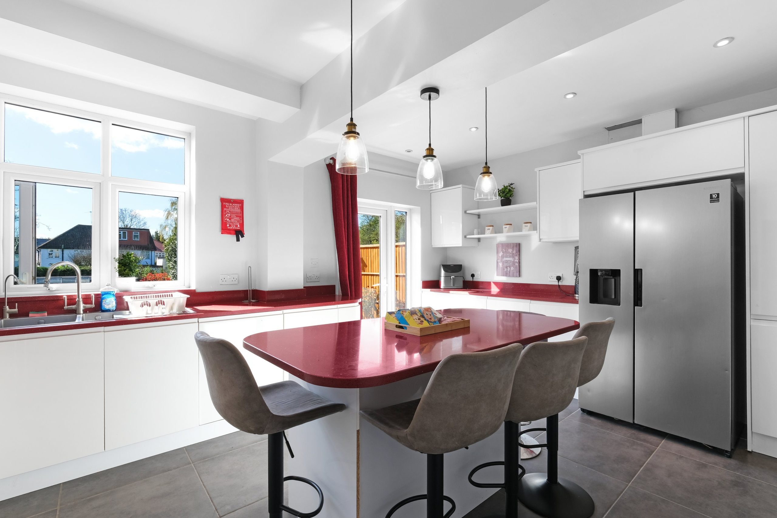 The kitchen is the centre piece of the property and genuinely impressive. White gloss handleless units wrap around a sweeping red gloss island with five bar stools, pendant lighting overhead and a large American-style Samsung fridge freezer. A NEFF double oven and six-burner SMEG gas hob make it a proper cooking kitchen rather than a token one. The island seats five on its own and the separate dining room off the kitchen has a rectangular wooden table with four chairs for more formal meals. The conservatory adds further flexible living space with a sofa and direct access to the garden.