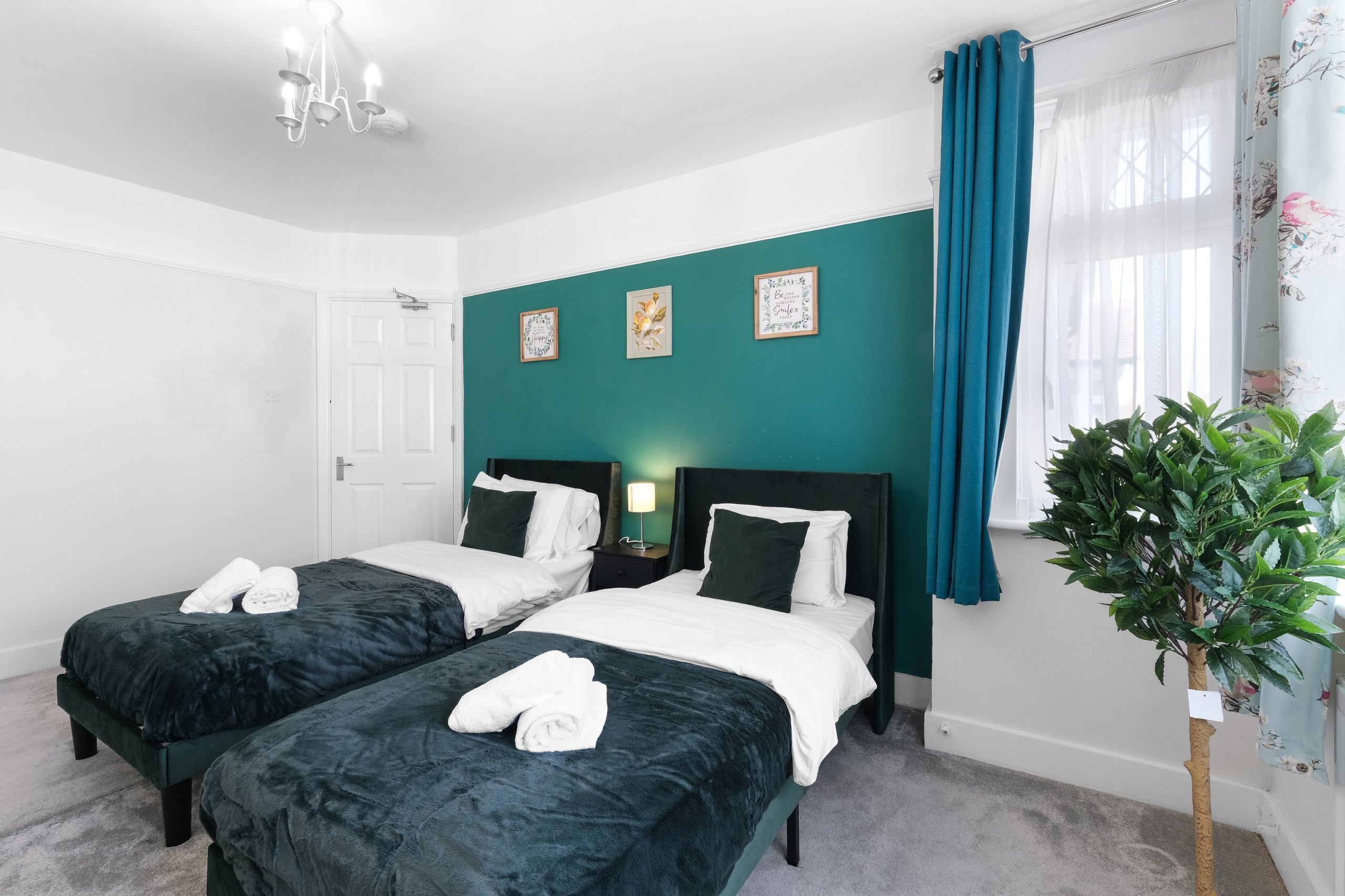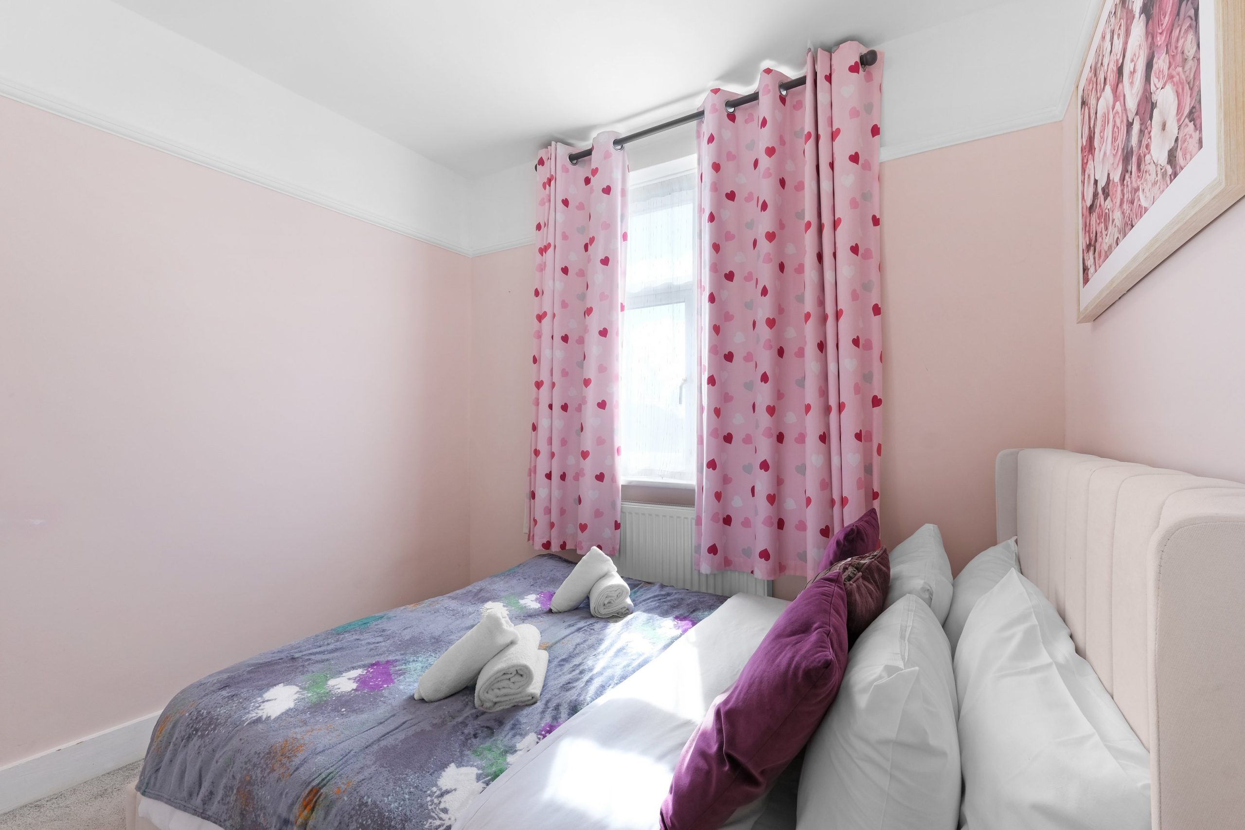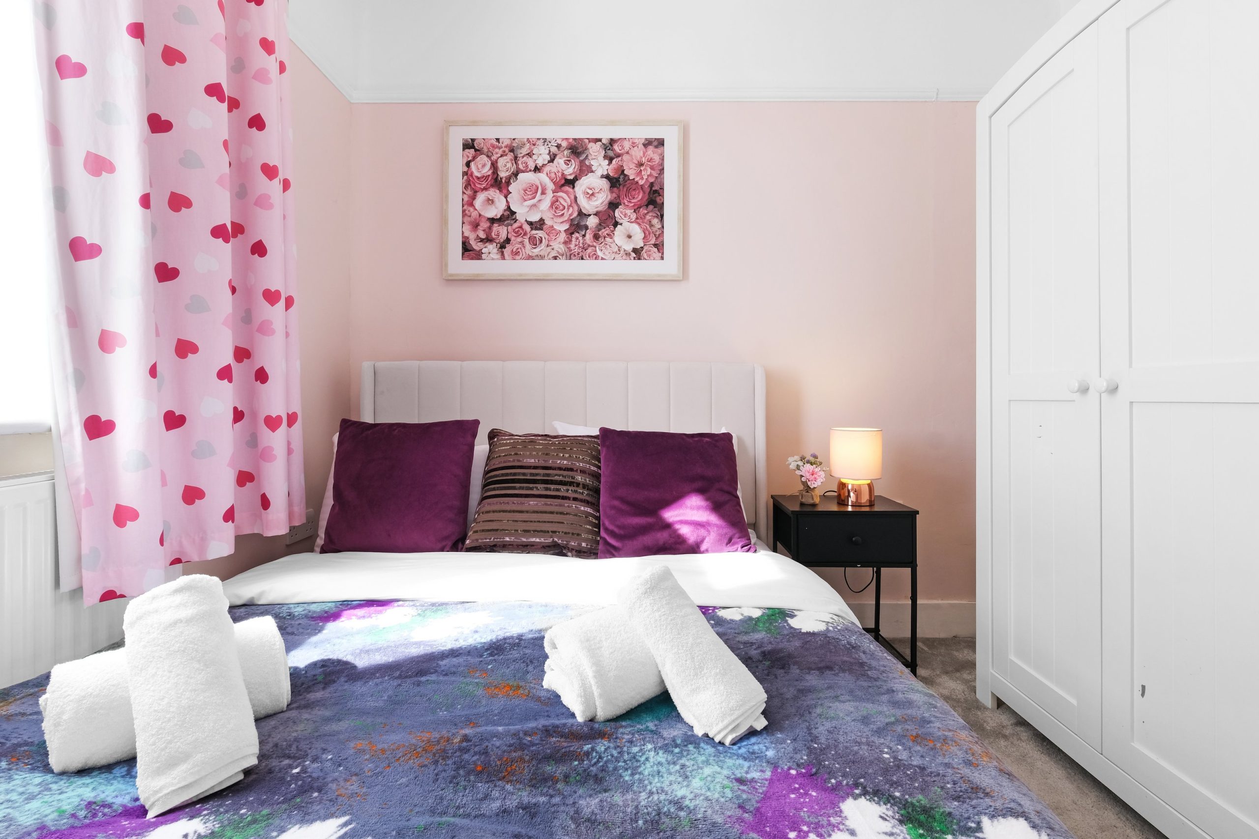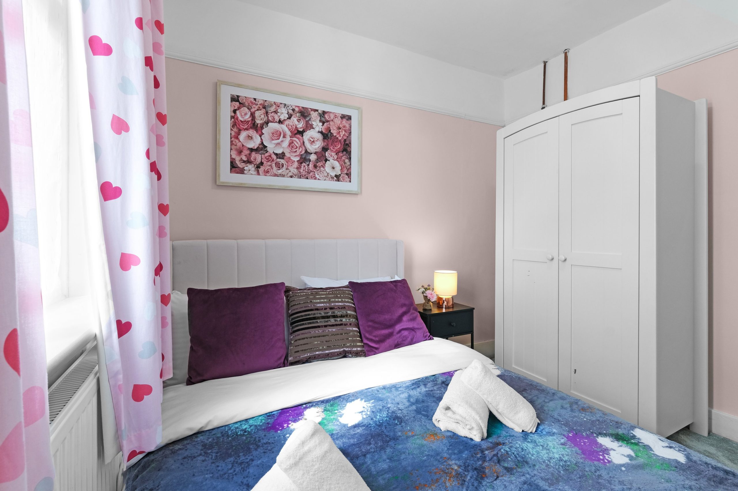 The living room is bright and comfortable with a Smart TV and opens into the rest of the ground floor. Upstairs the five bedrooms each have their own distinct character. Two rooms have bold teal feature walls with twin single beds and are well suited to sharing guests or colleagues. Two further rooms have warm yellow feature walls with single beds. The fifth is a generous double with a pink floral feel and a double bed dressed in rich purple. All rooms are well styled with wardrobes or clothes storage included.