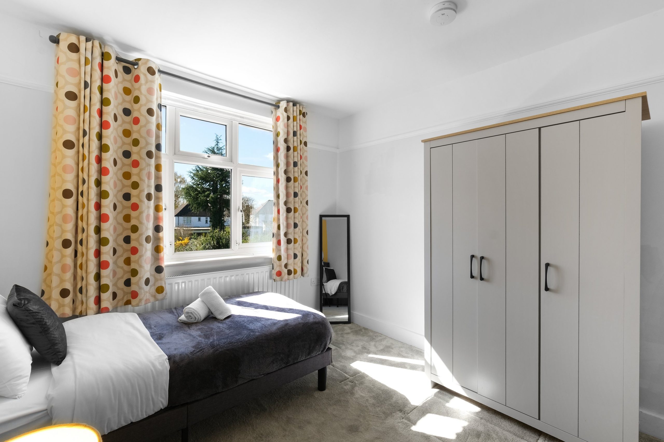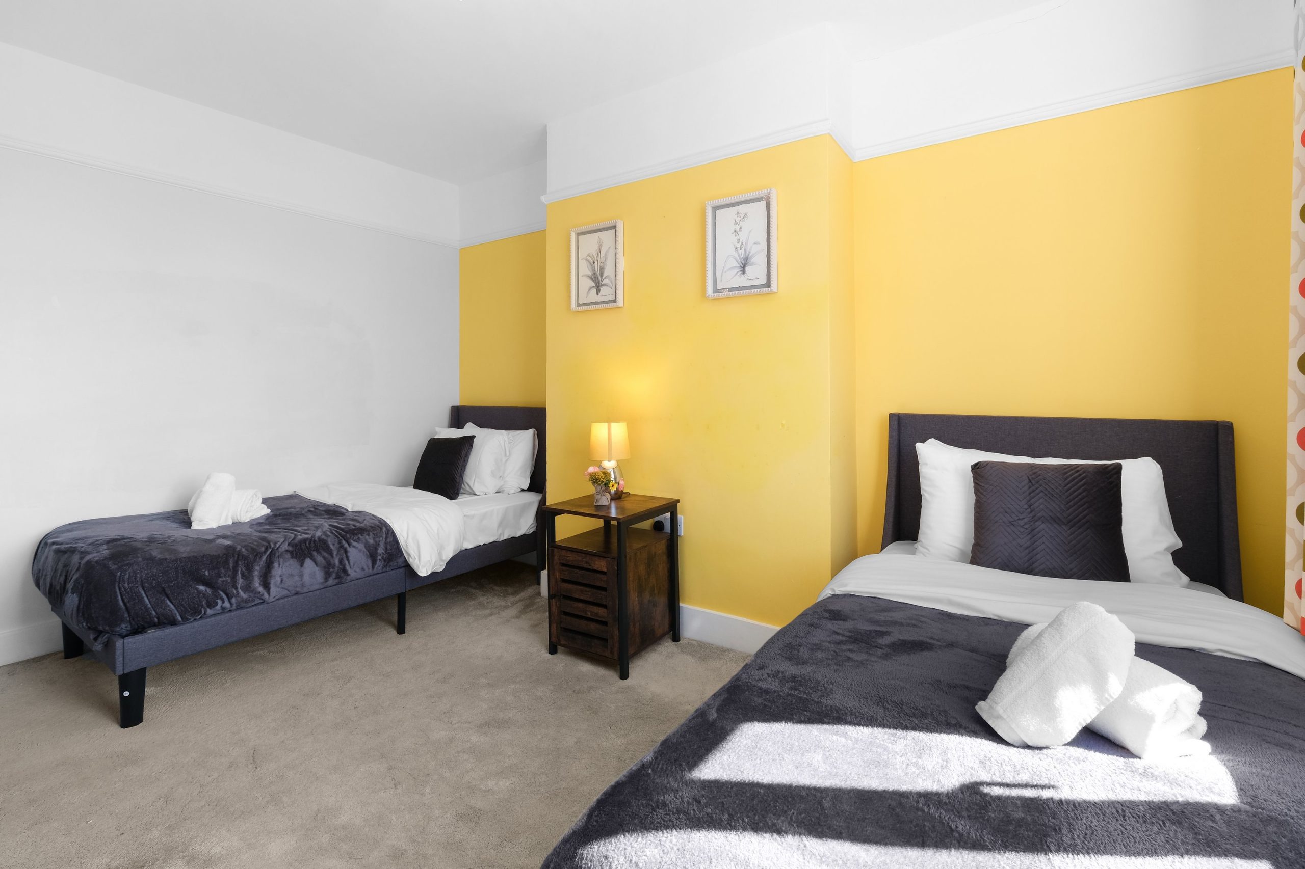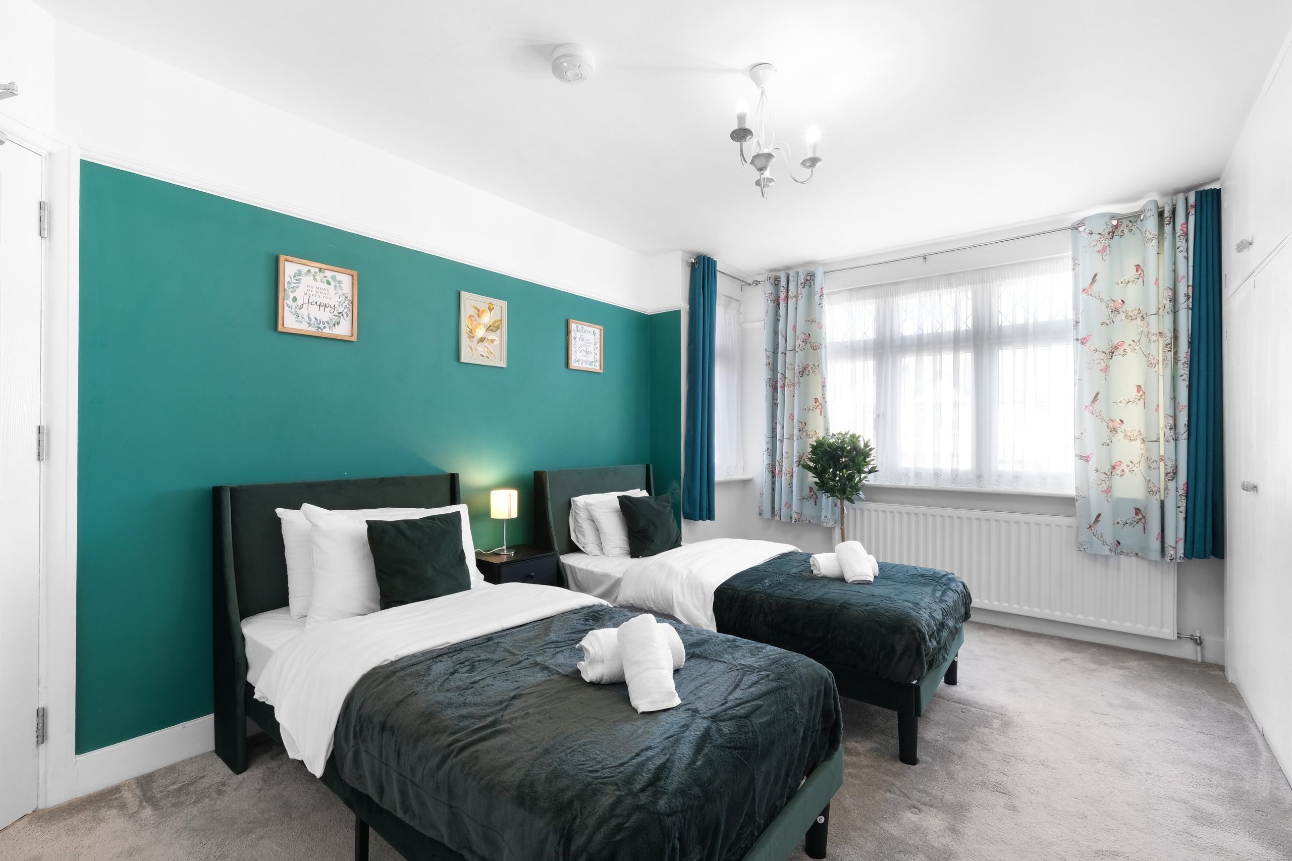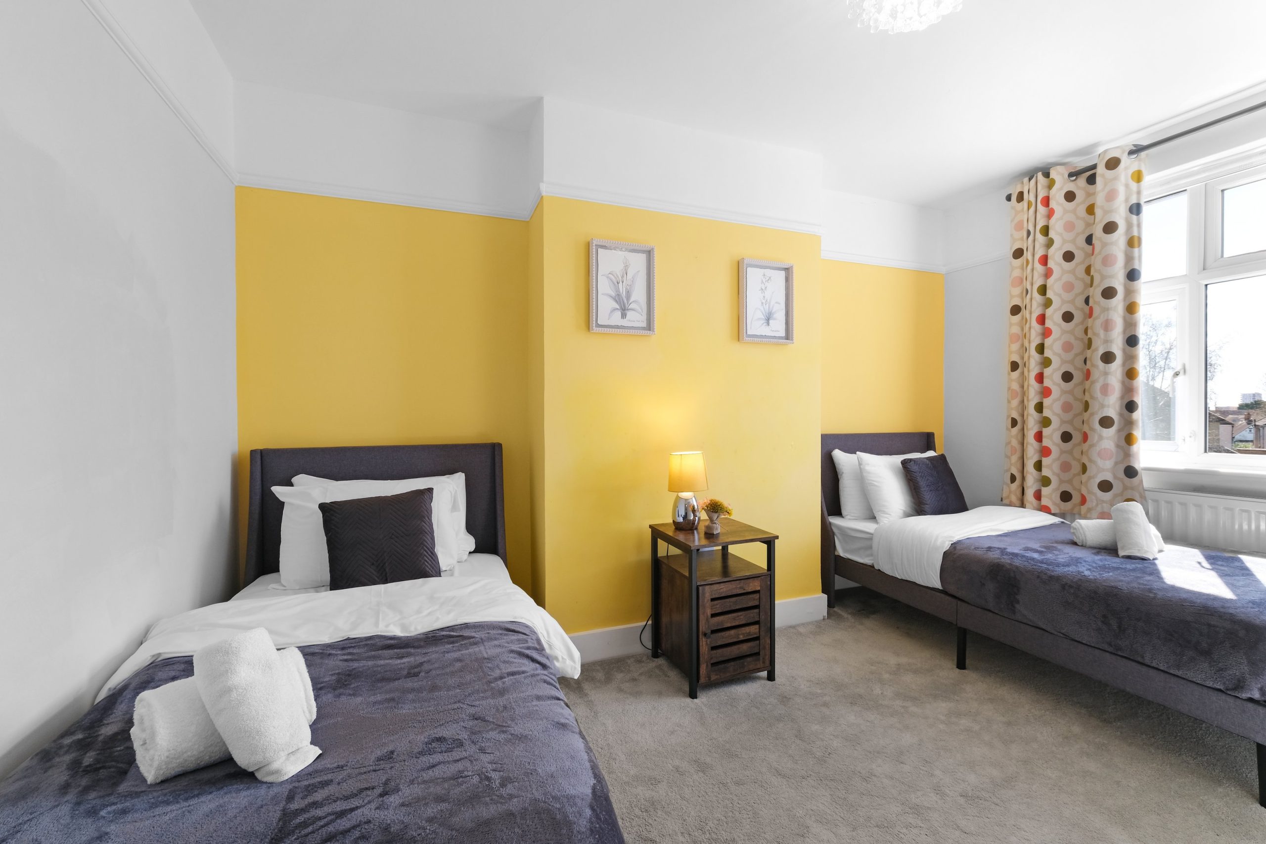 The living room is bright and comfortable with a Smart TV and opens into the rest of the ground floor. Upstairs the five bedrooms each have their own distinct character. Two rooms have bold teal feature walls with twin single beds and are well suited to sharing guests or colleagues. Two further rooms have warm yellow feature walls with single beds. The fifth is a generous double with a pink floral feel and a double bed dressed in rich purple. All rooms are well styled with wardrobes or clothes storage included.