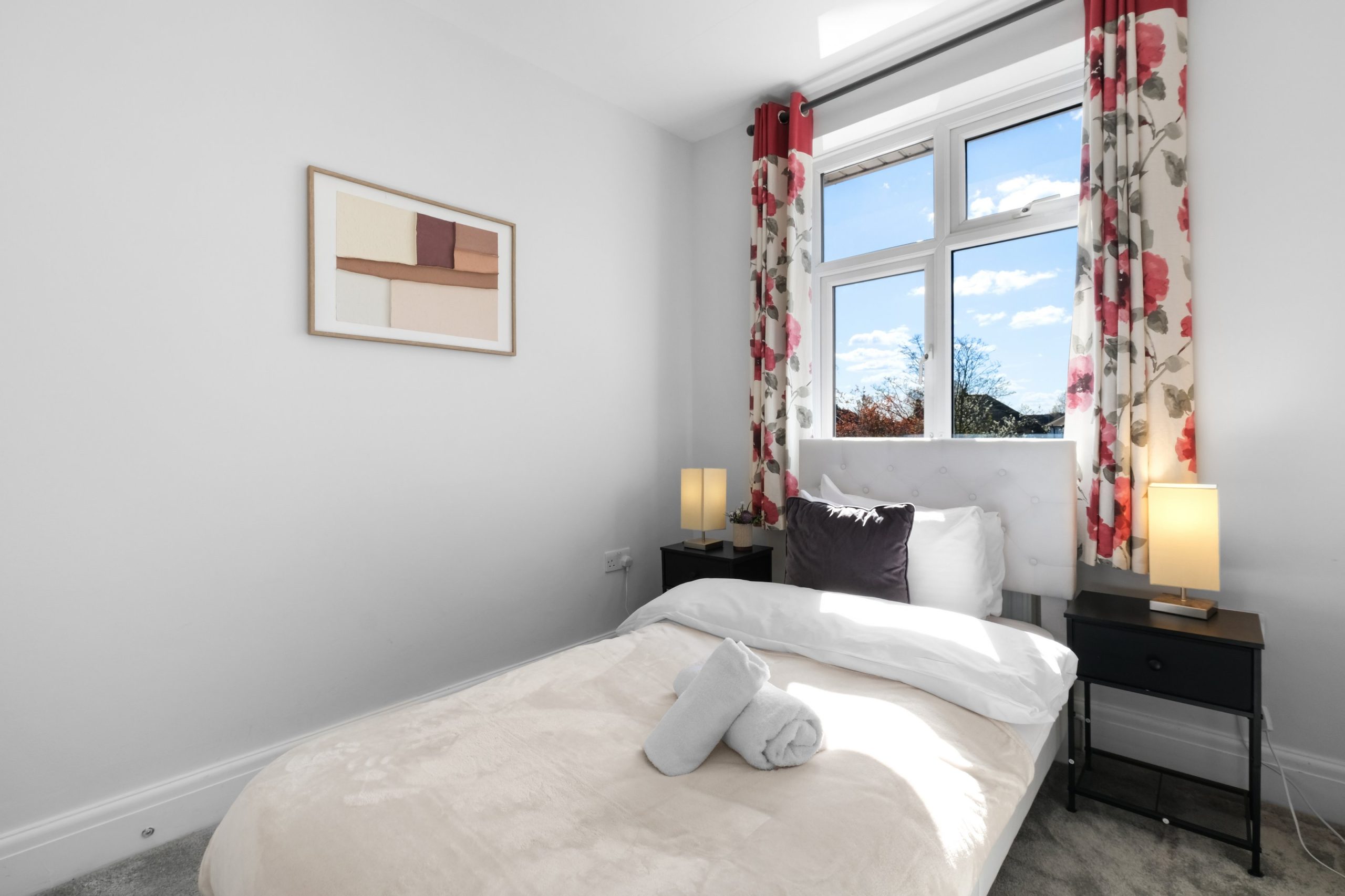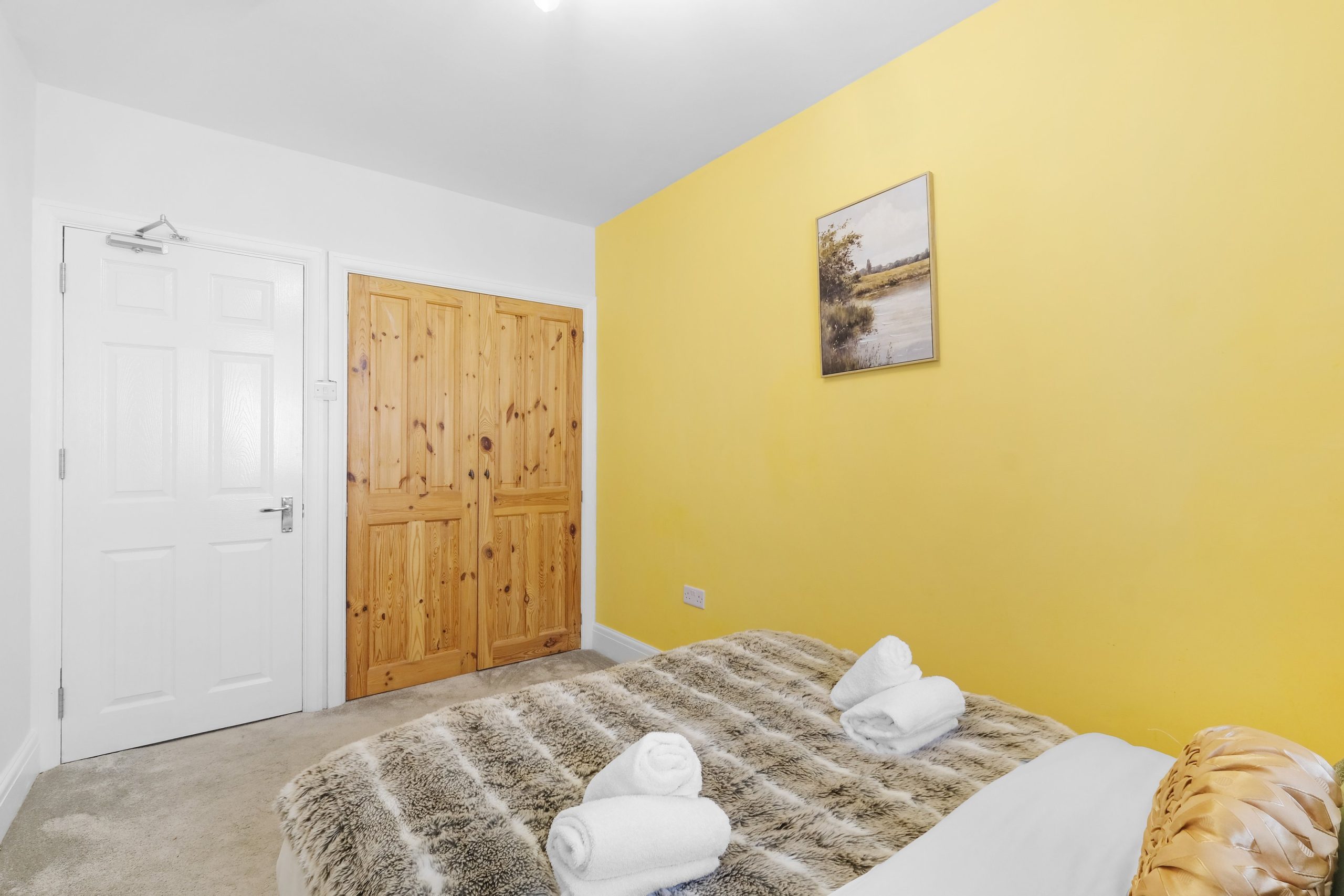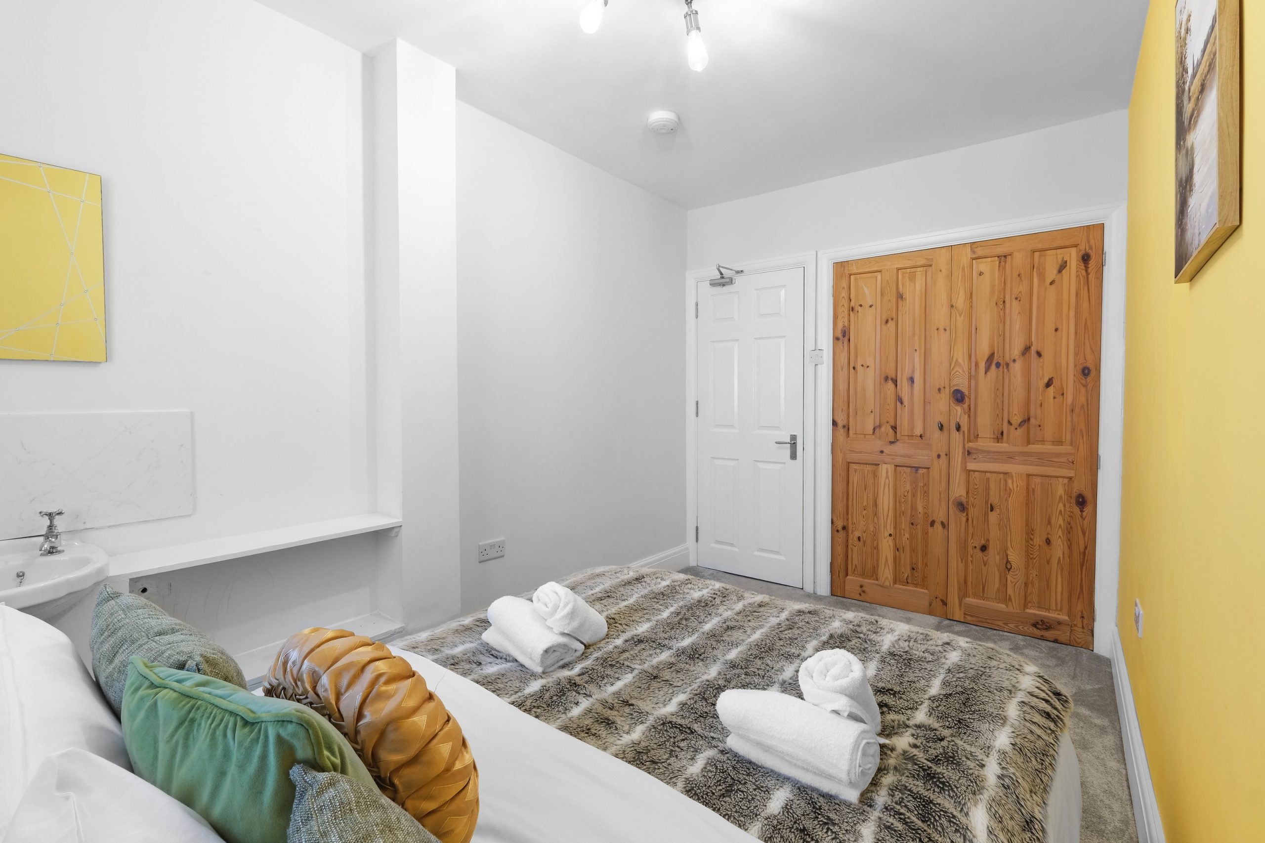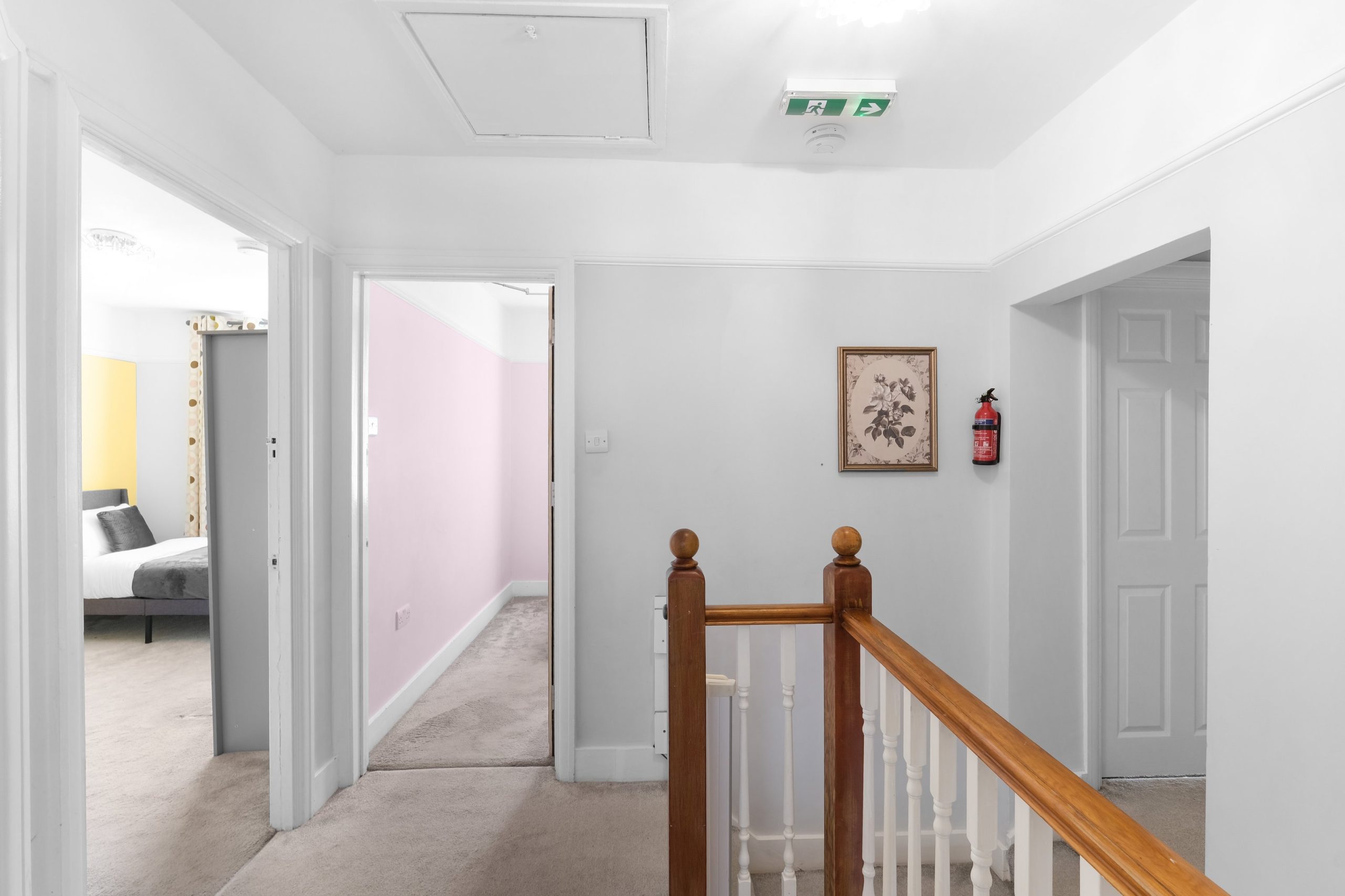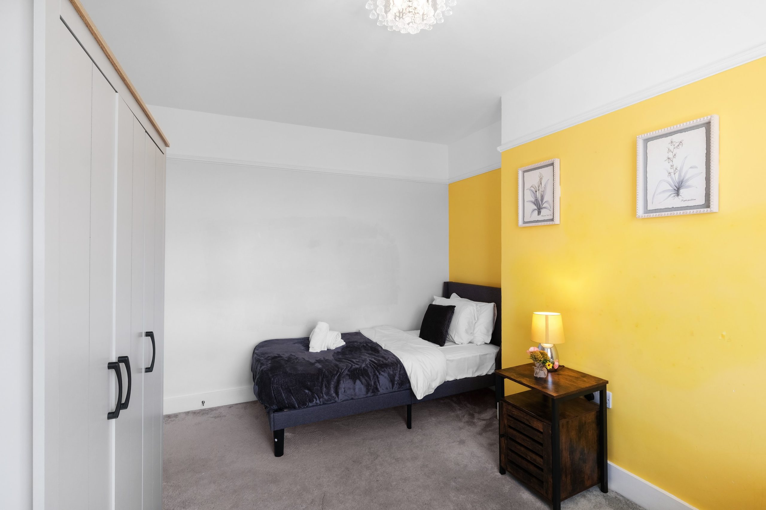 The living room is bright and comfortable with a Smart TV and opens into the rest of the ground floor. Upstairs the five bedrooms each have their own distinct character. Two rooms have bold teal feature walls with twin single beds and are well suited to sharing guests or colleagues. Two further rooms have warm yellow feature walls with single beds. The fifth is a generous double with a pink floral feel and a double bed dressed in rich purple. All rooms are well styled with wardrobes or clothes storage included.