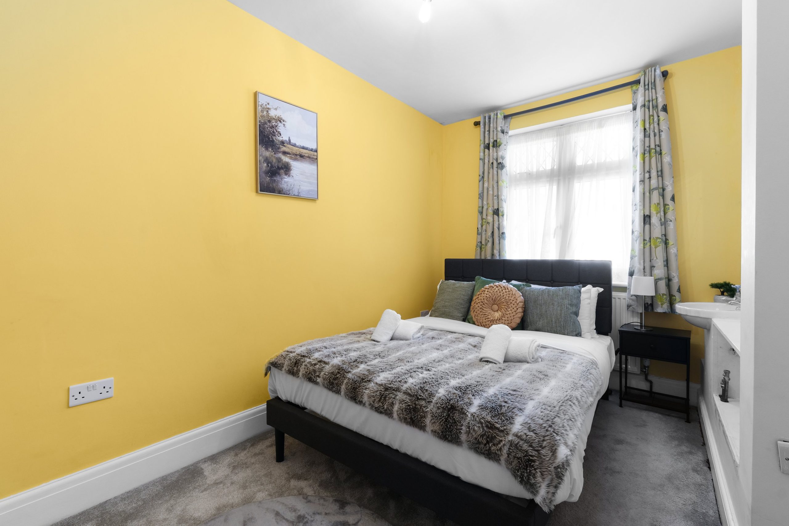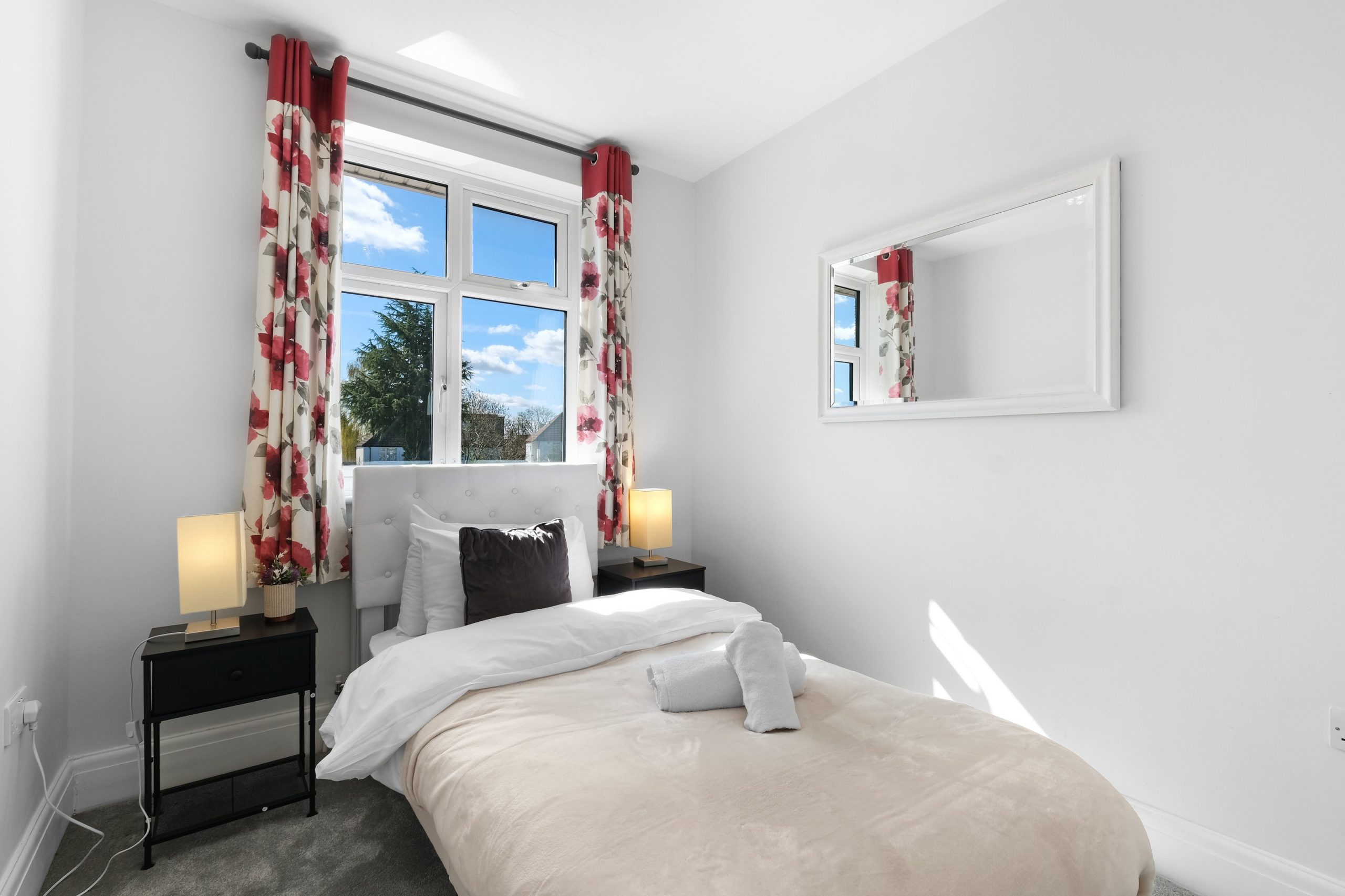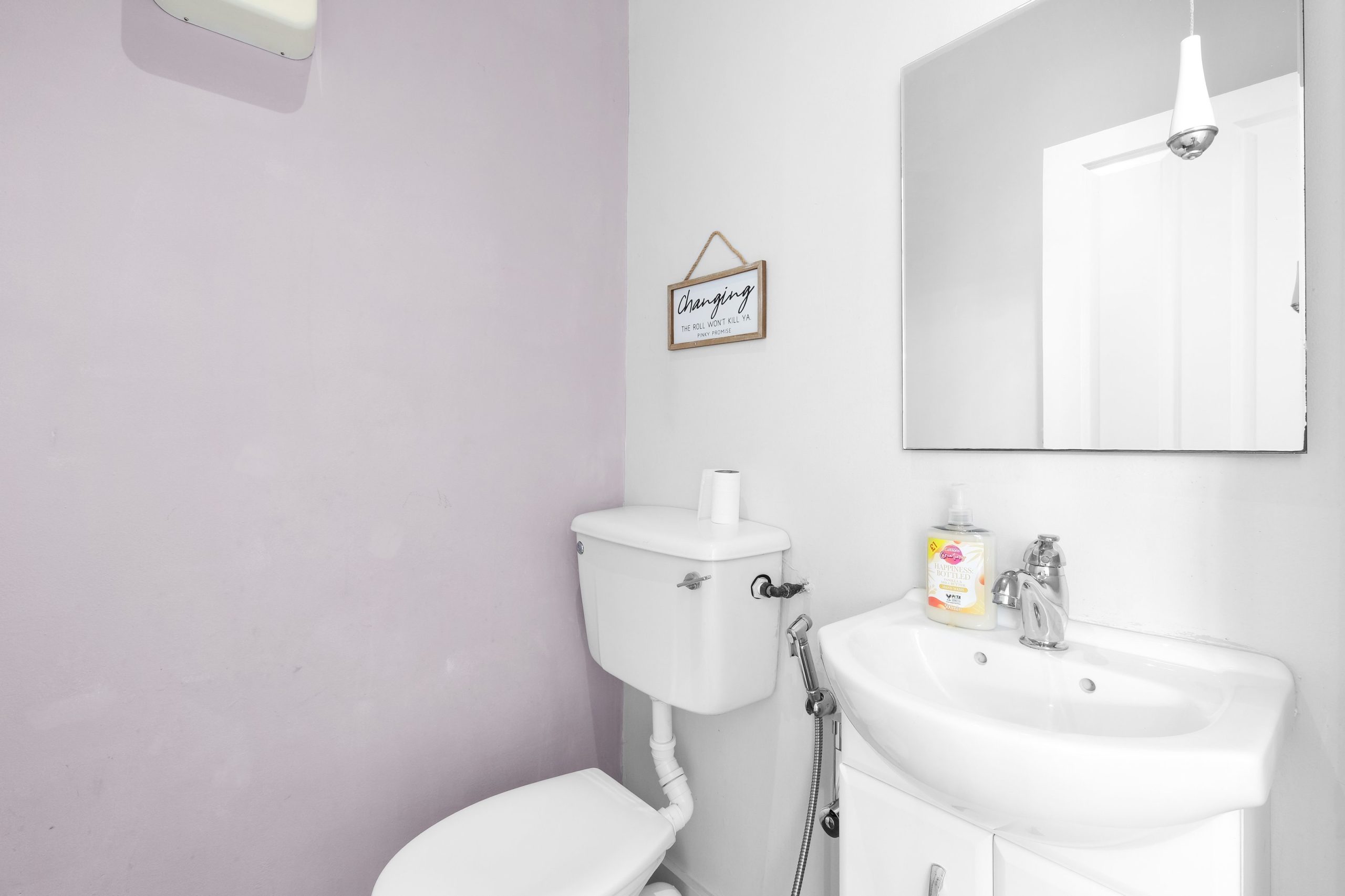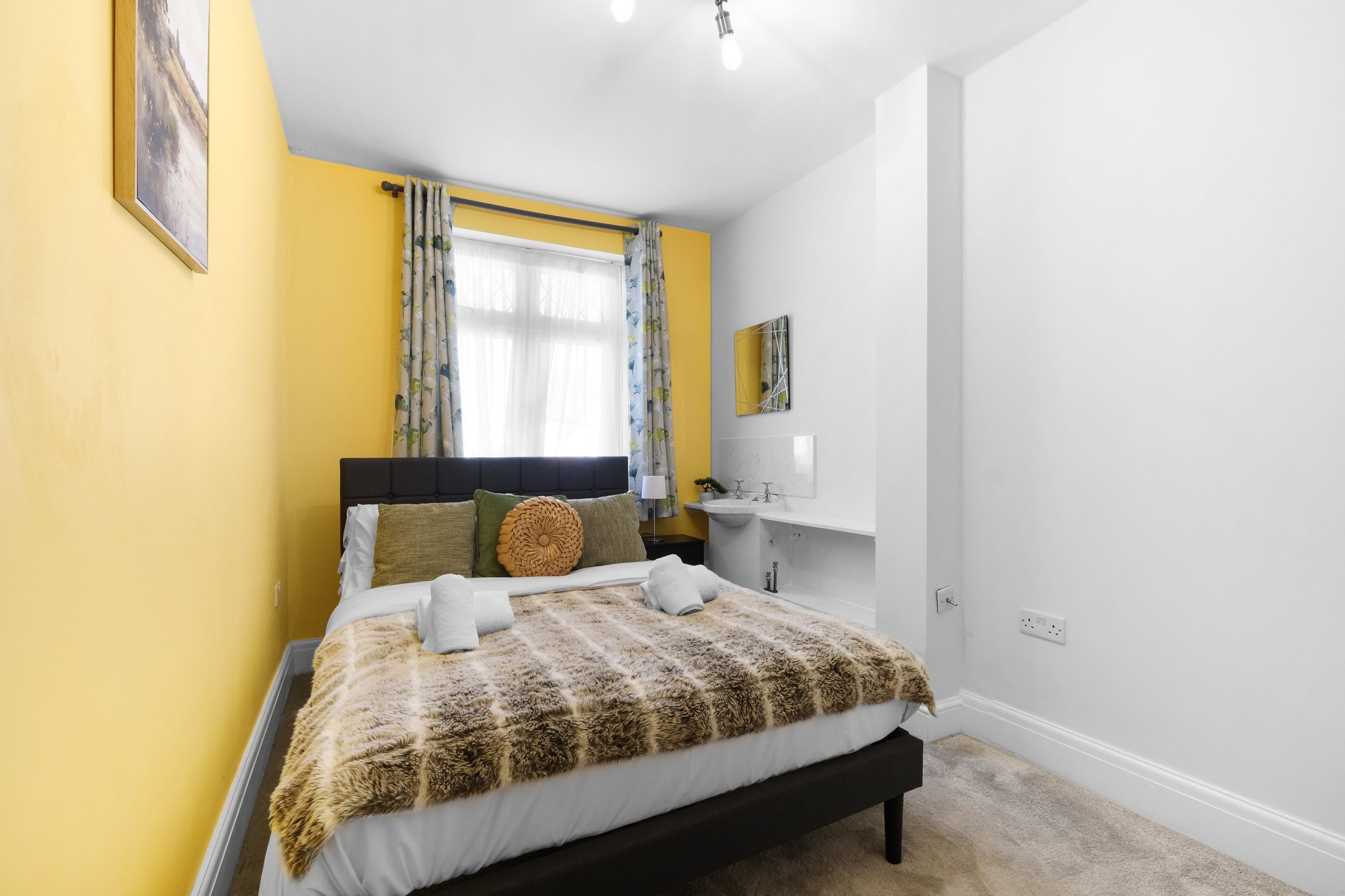 The living room is bright and comfortable with a Smart TV and opens into the rest of the ground floor. Upstairs the five bedrooms each have their own distinct character. Two rooms have bold teal feature walls with twin single beds and are well suited to sharing guests or colleagues. Two further rooms have warm yellow feature walls with single beds. The fifth is a generous double with a pink floral feel and a double bed dressed in rich purple. All rooms are well styled with wardrobes or clothes storage included.