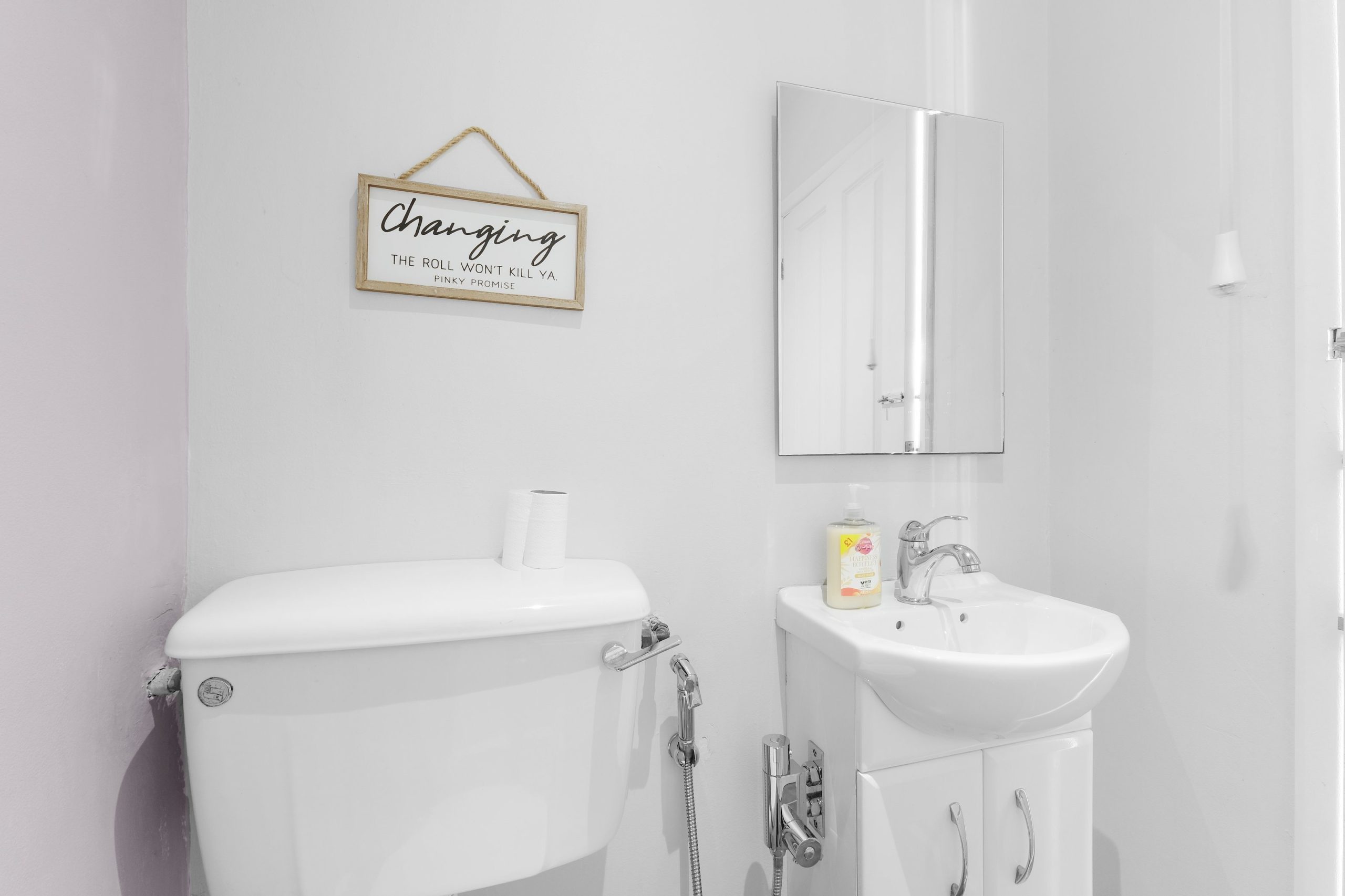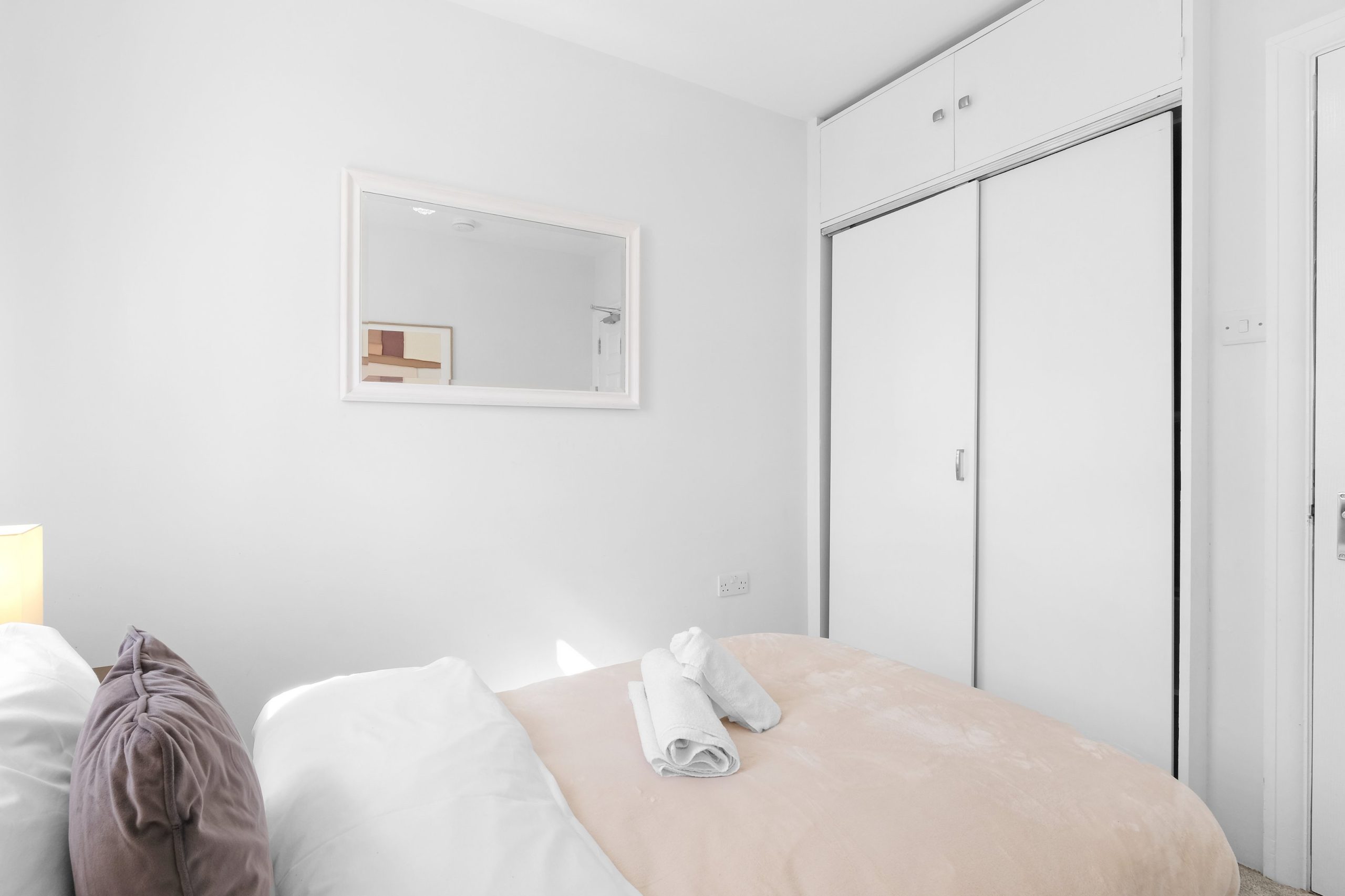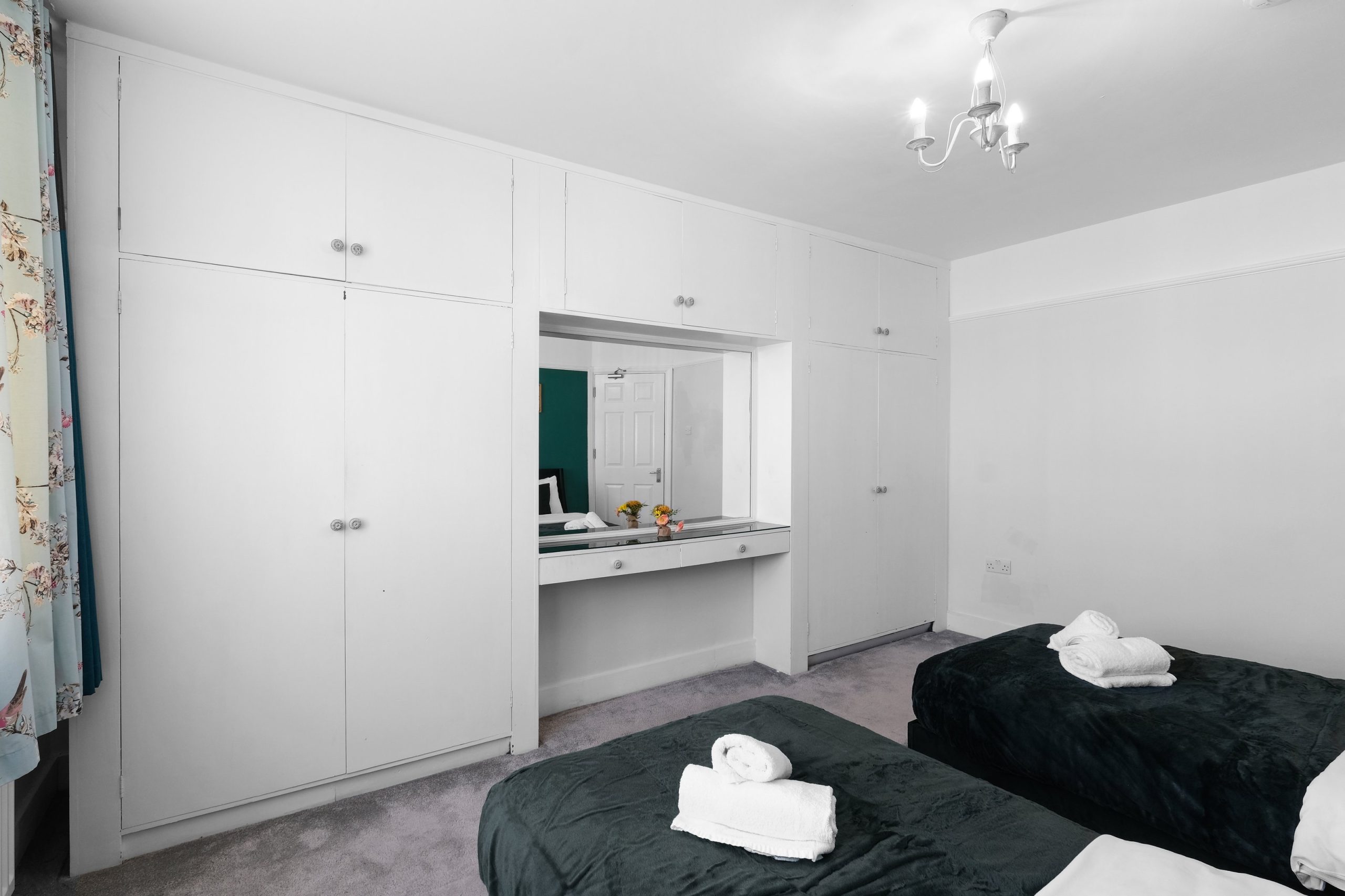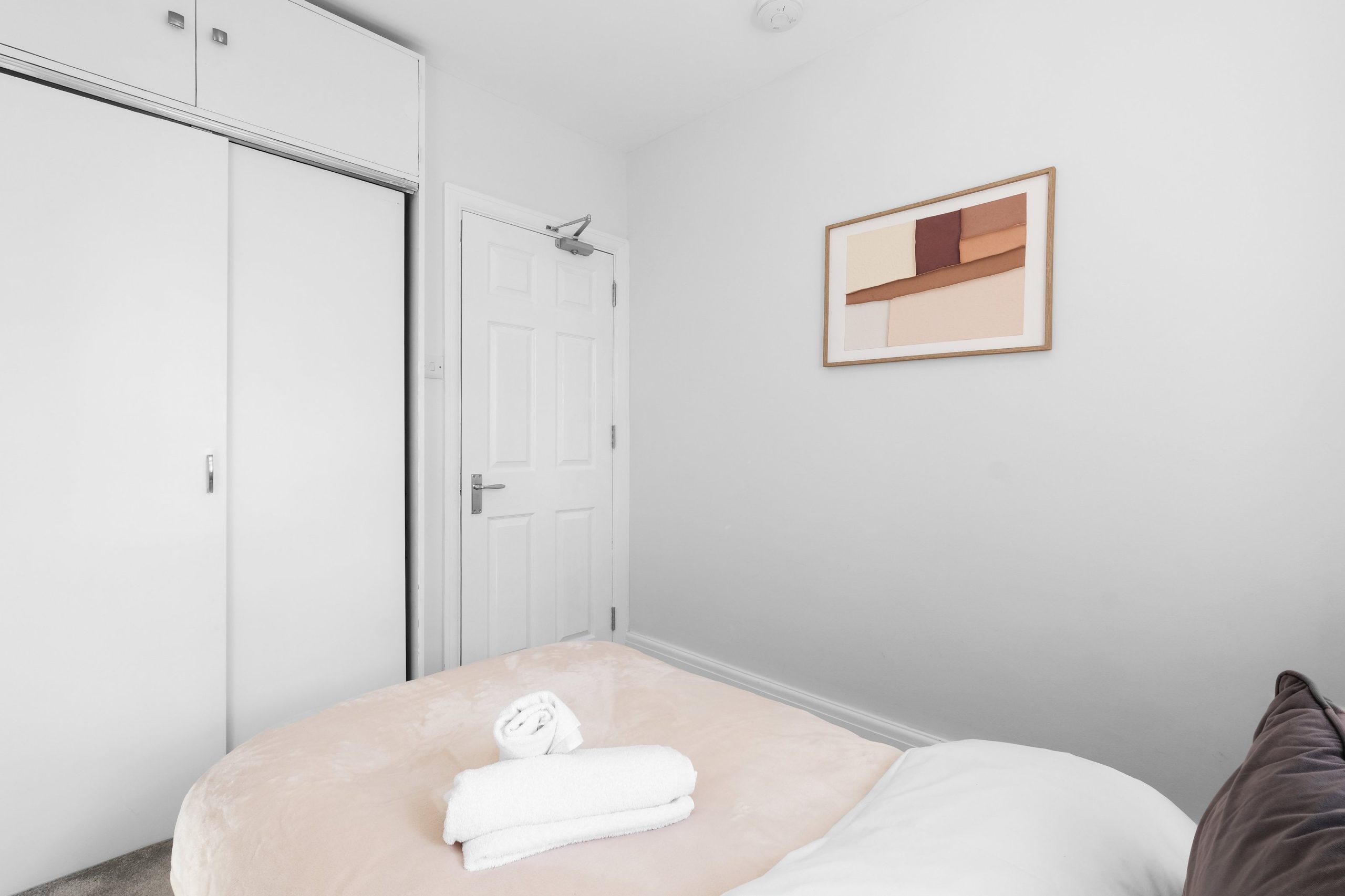 The living room is bright and comfortable with a Smart TV and opens into the rest of the ground floor. Upstairs the five bedrooms each have their own distinct character. Two rooms have bold teal feature walls with twin single beds and are well suited to sharing guests or colleagues. Two further rooms have warm yellow feature walls with single beds. The fifth is a generous double with a pink floral feel and a double bed dressed in rich purple. All rooms are well styled with wardrobes or clothes storage included.
