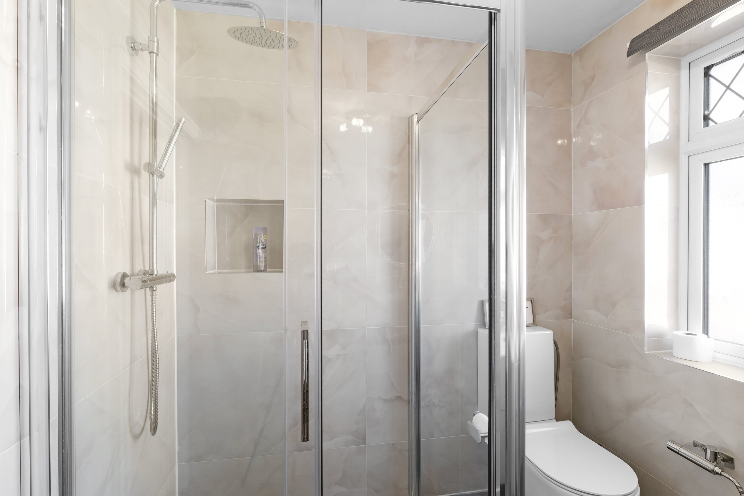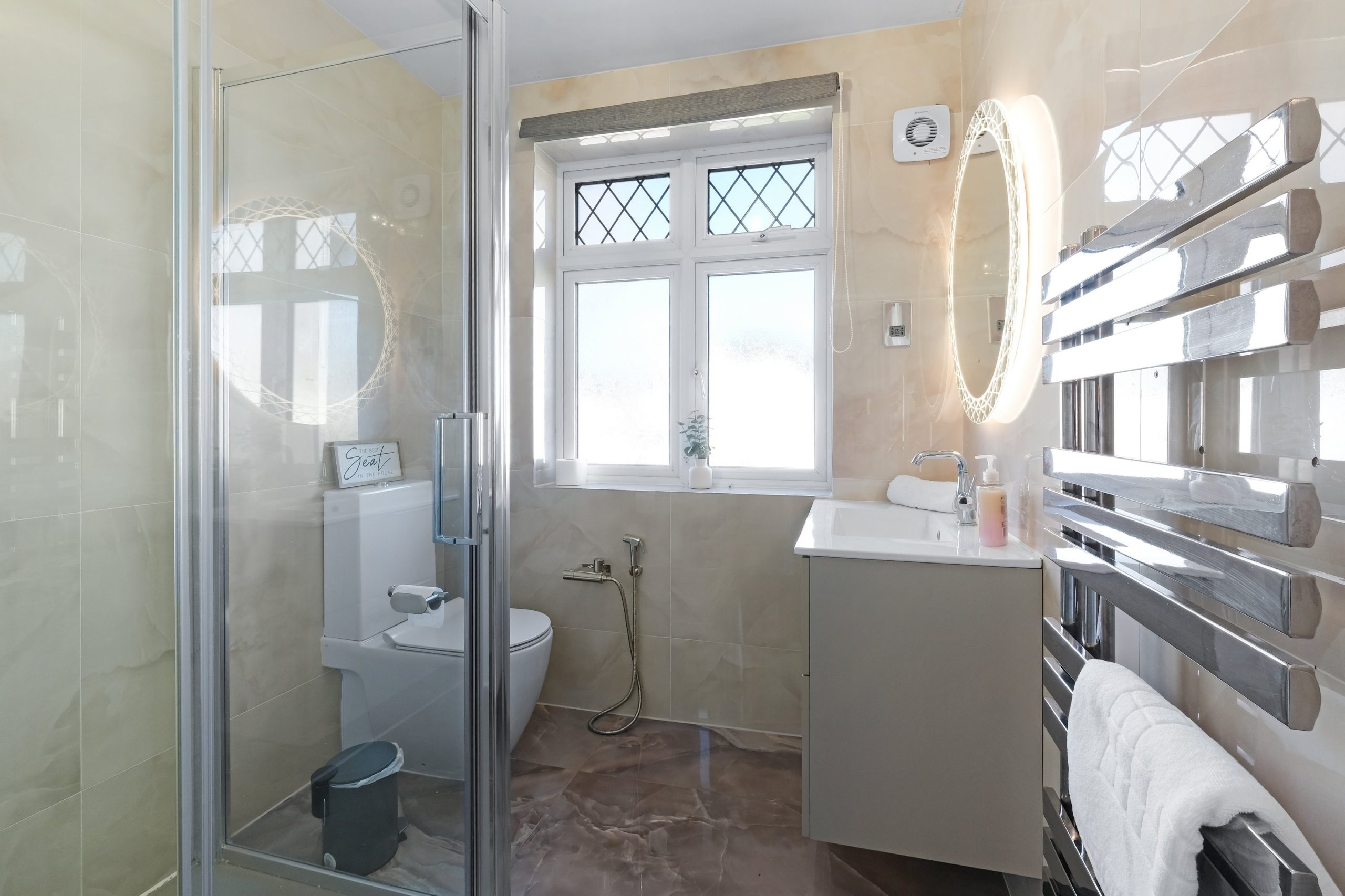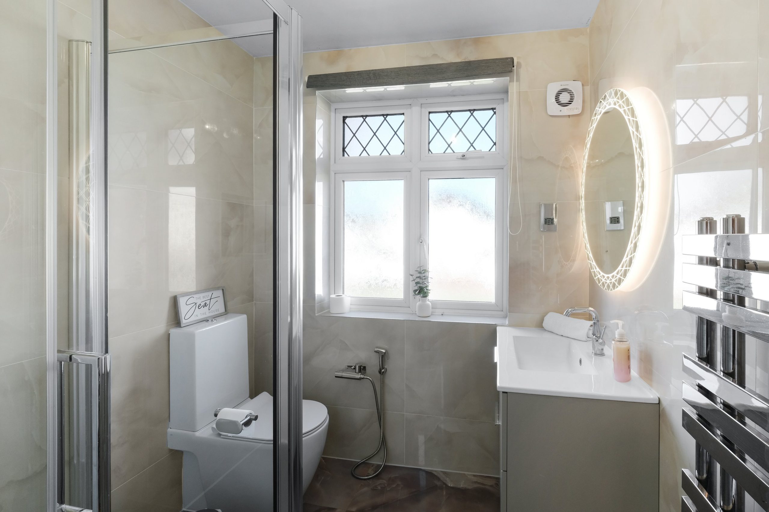 The family bathroom is a good size with a walk-in shower cubicle, a separate bath and a backlit oval mirror. There is also a separate downstairs WC on the ground floor.
