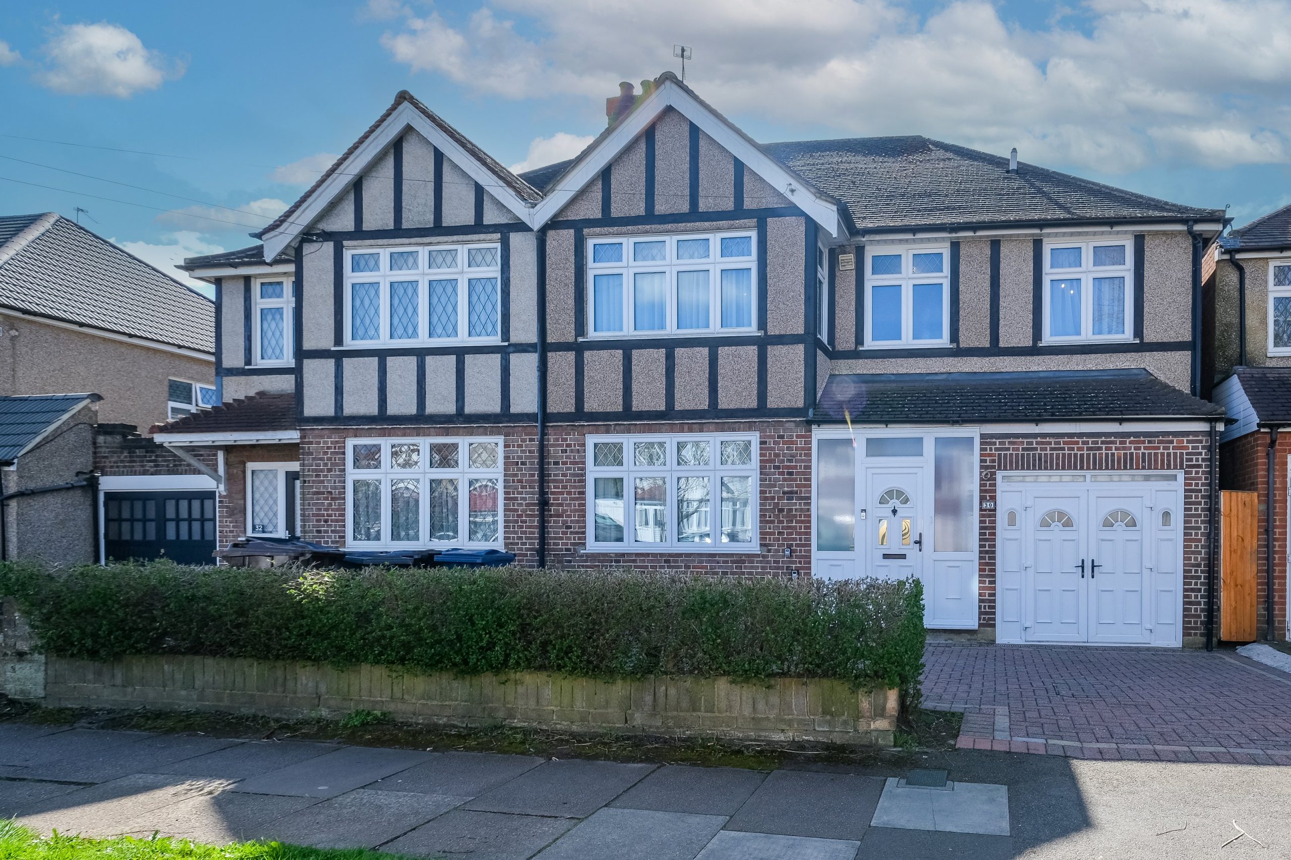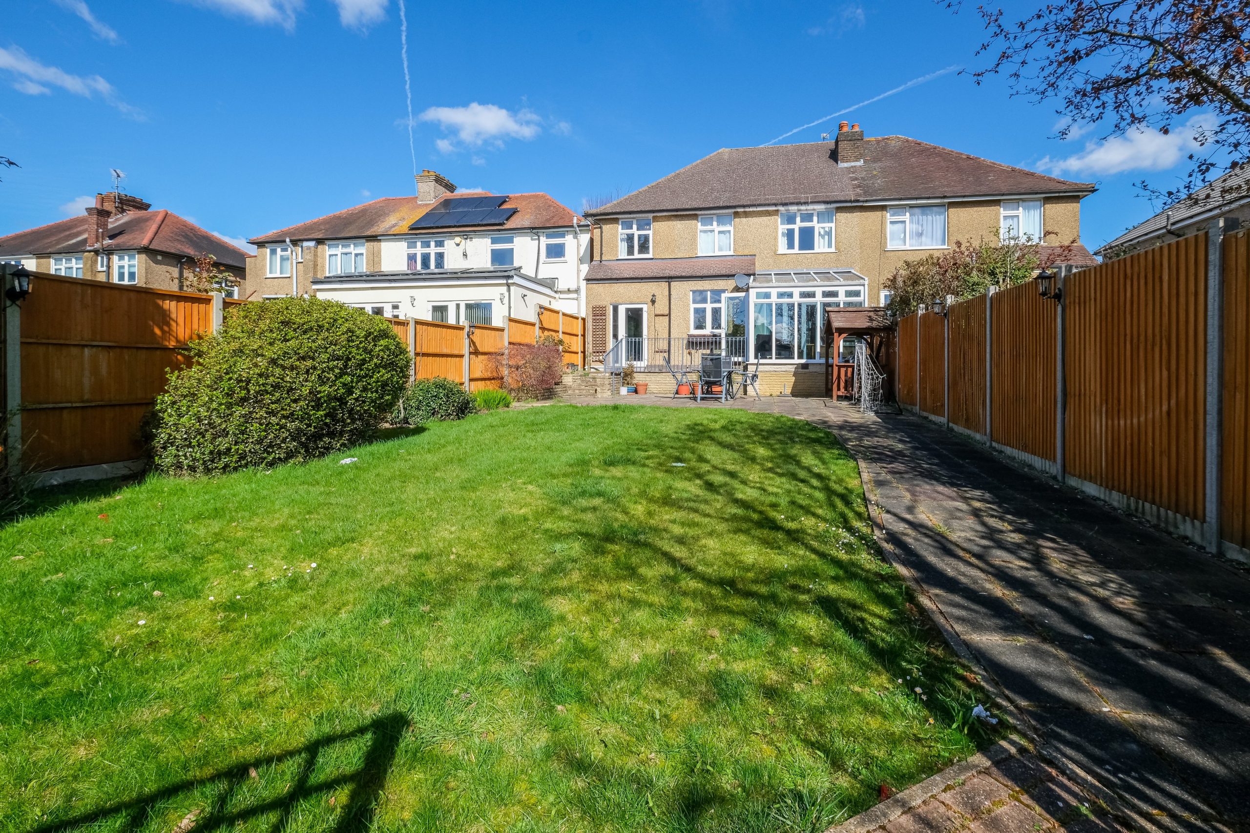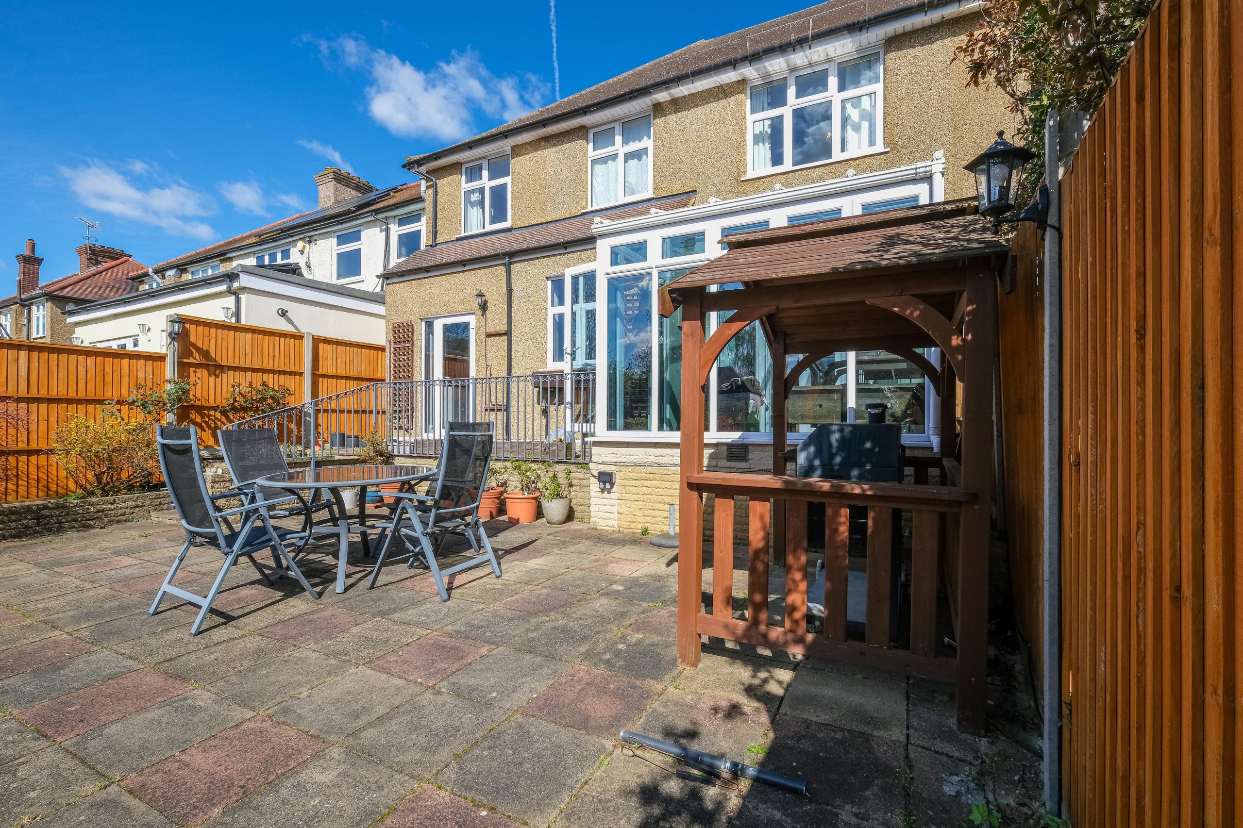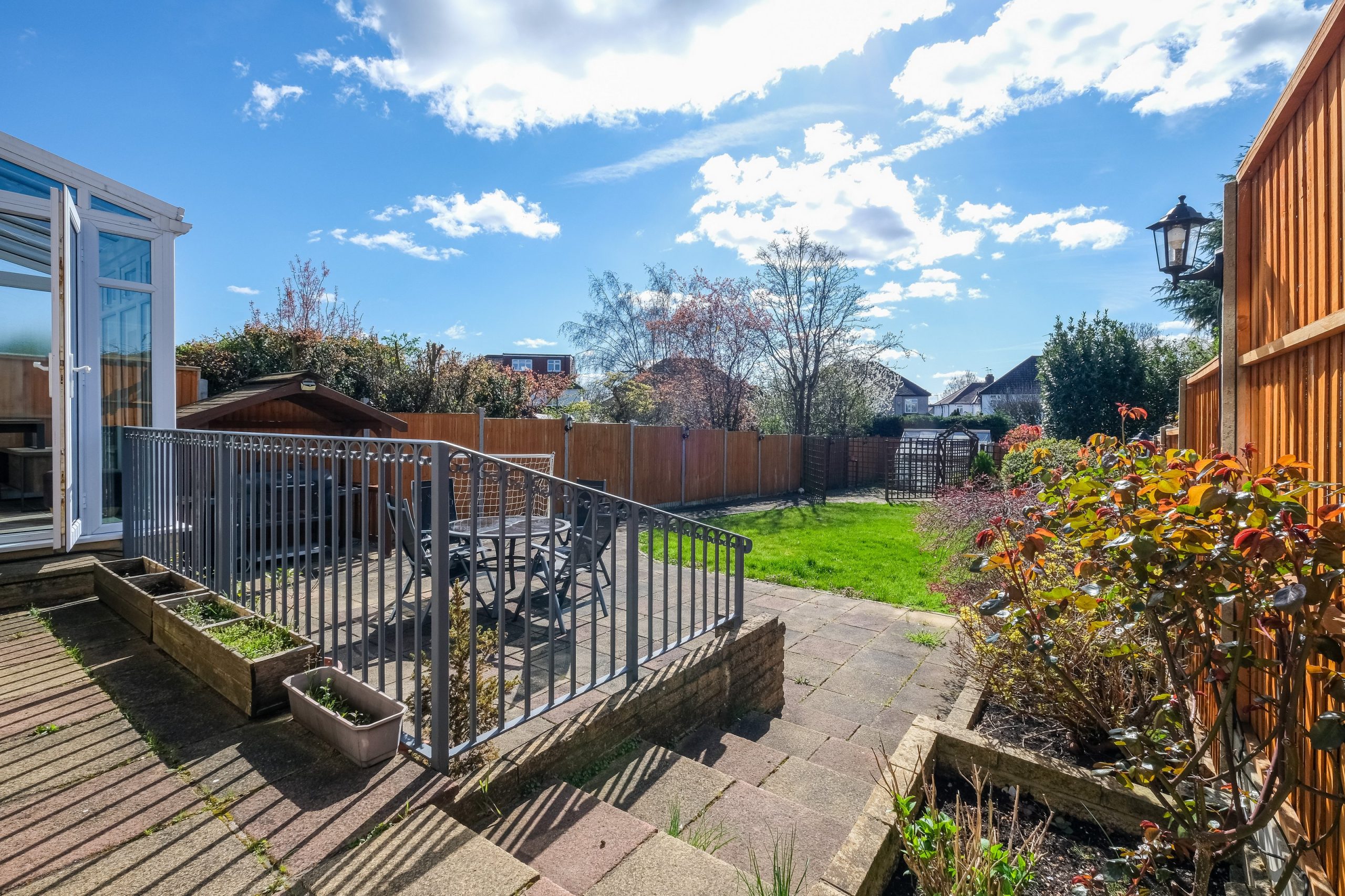 Outside the rear garden is a real highlight. There is a raised timber deck off the conservatory, a patio dining area with outdoor table and chairs under a pergola and a long stretch of lawn beyond enclosed by timber fencing. The front of the property has a block-paved driveway with space for two vehicles and a garage.