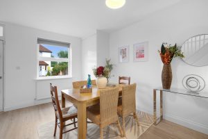 Step into a spacious entrance hall that leads to a bright and airy living area, thoughtfully furnished with plush seating and a sleek entertainment system—perfect for cosy evenings or relaxed social gatherings. The adjoining dining space provides a welcoming setting for shared meals, whether it’s a quick breakfast or a celebratory dinner.