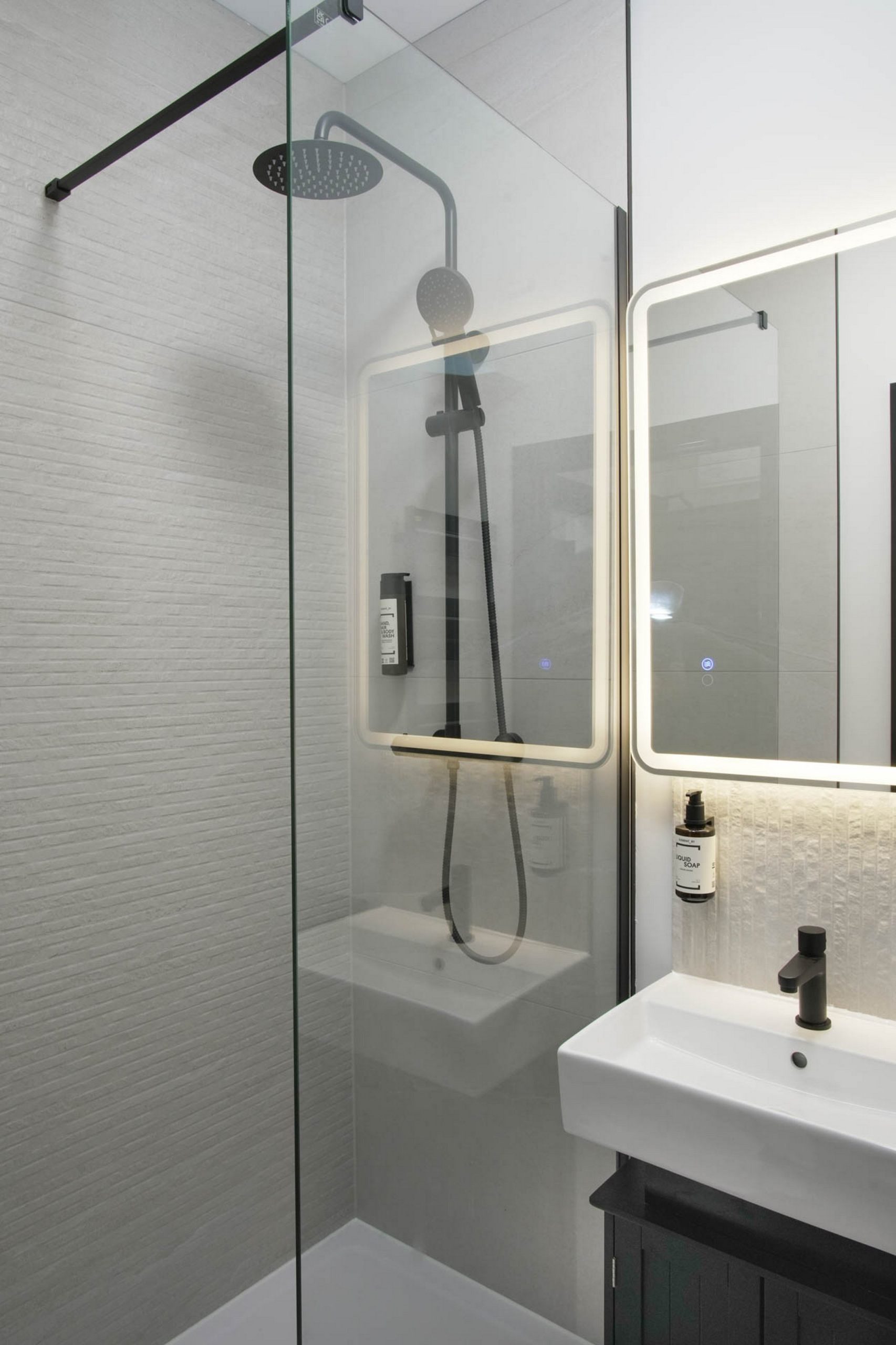 Bathroom: A sleek, modern room offering a premium two-head shower system, heated towel rail, and vanity mirror.