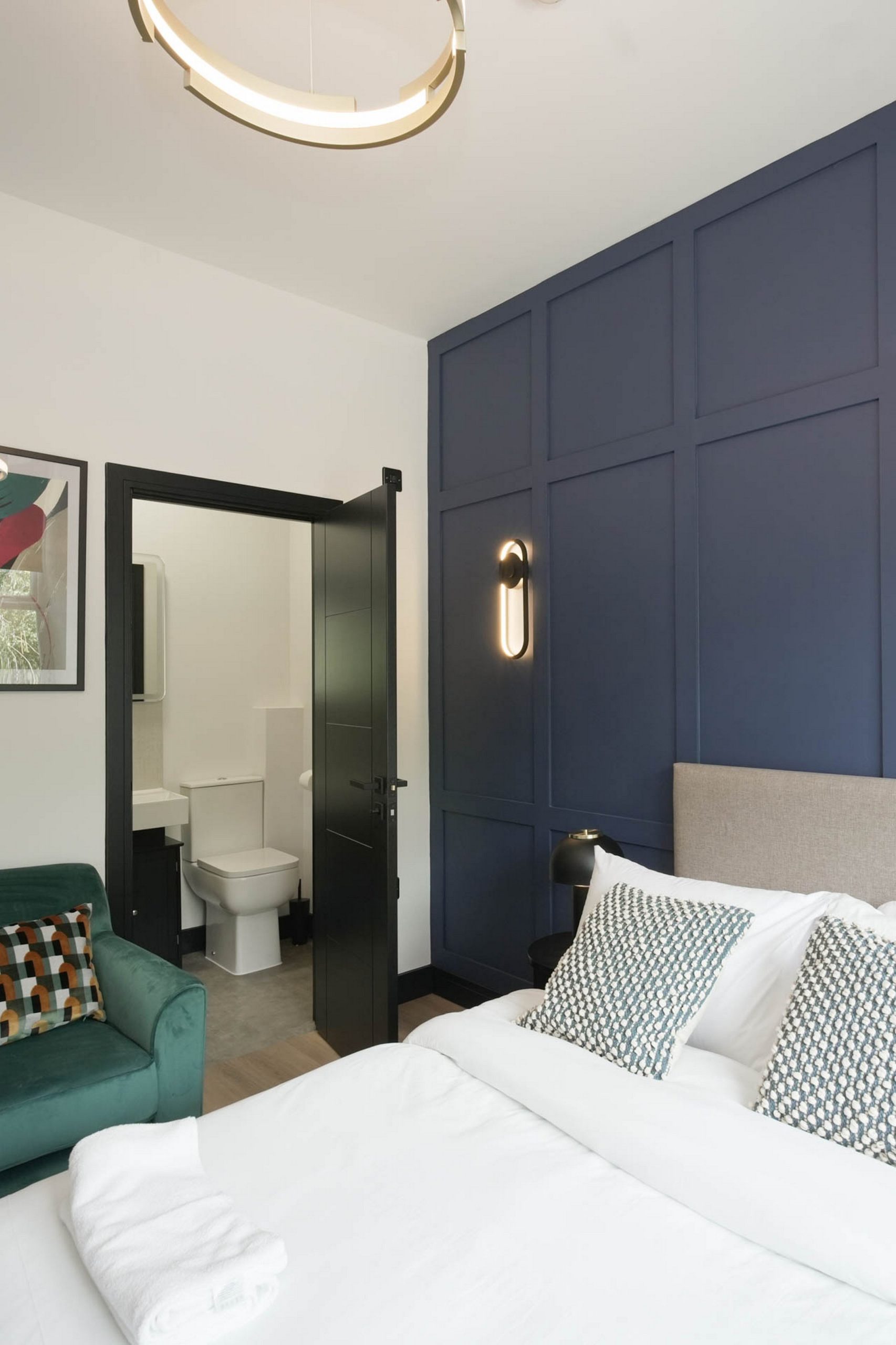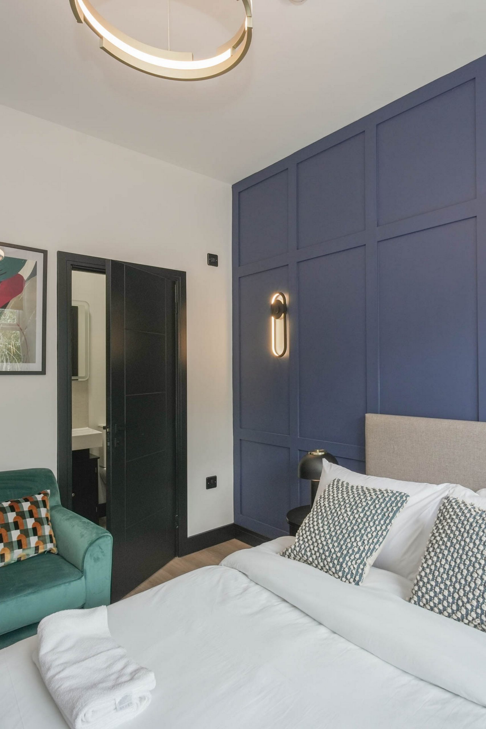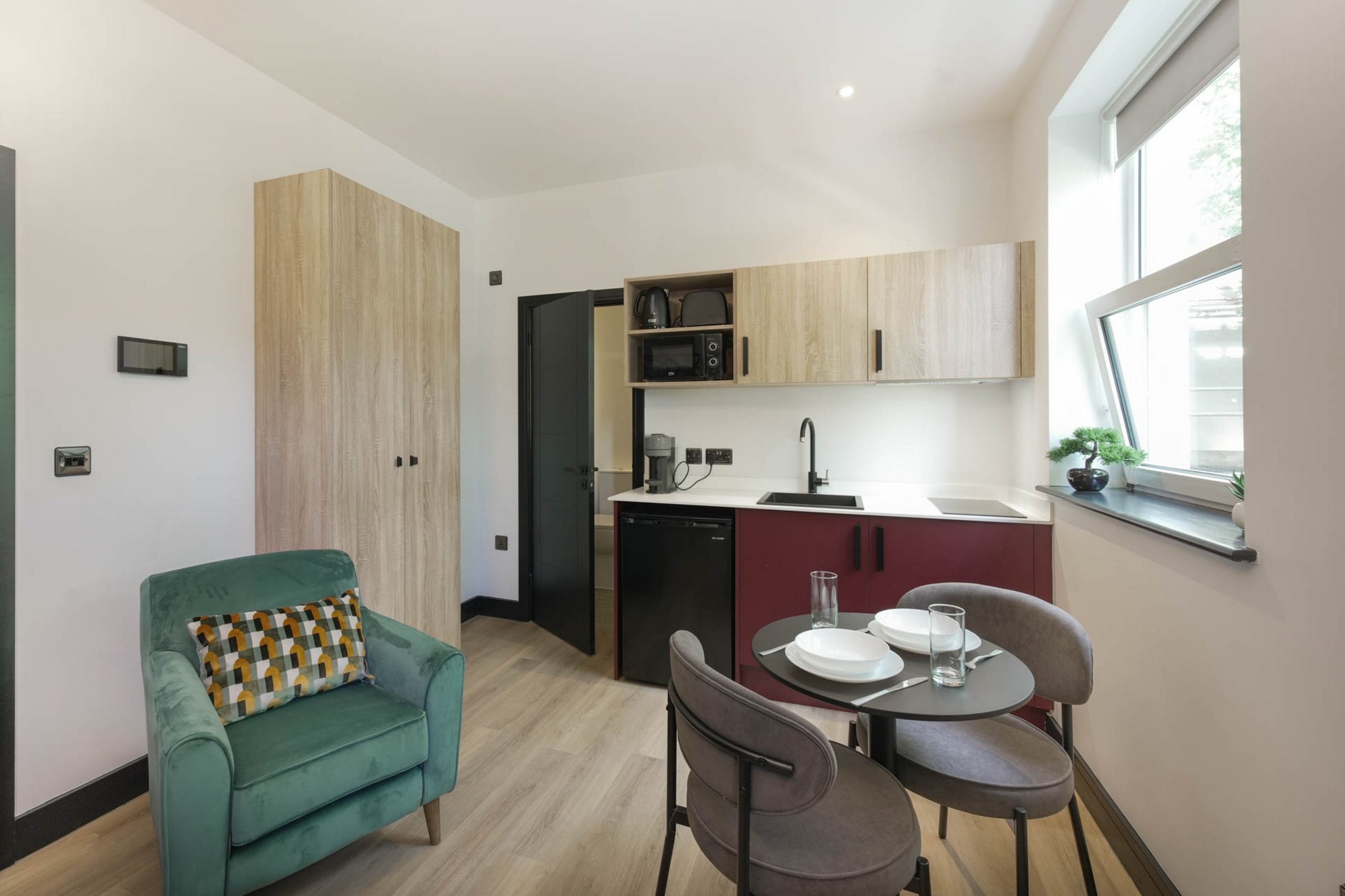 Experience premium comfort in this newly renovated 1-bedroom apartment, blending historic charm with a high-end modern finish. A unique decorative partition creates a stylish separation for the bedroom, which features a luxurious SuperKing bed. The living area includes two comfortable armchairs, a Smart TV, and a dedicated workspace. Enjoy a designer kitchen, luxury dual-head shower, and secure on-site parking with superfast WiFi throughout.