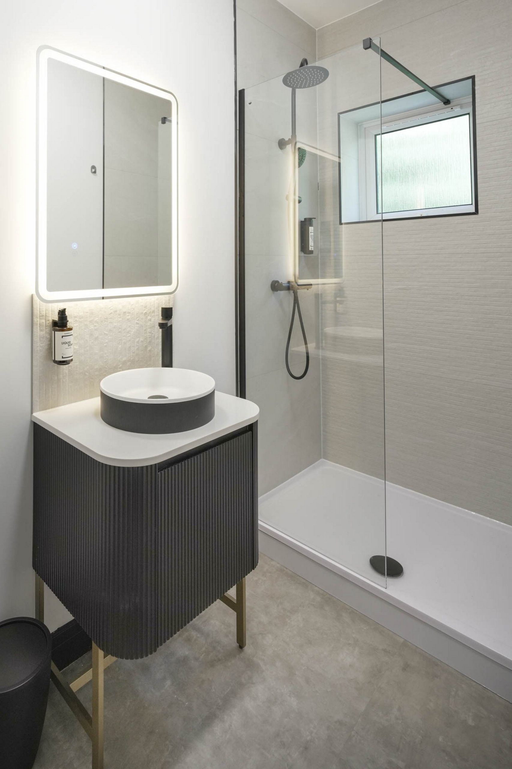 Bathroom: A modern, spa-like space equipped with a two-head shower system, heated towel rail, and vanity mirror.