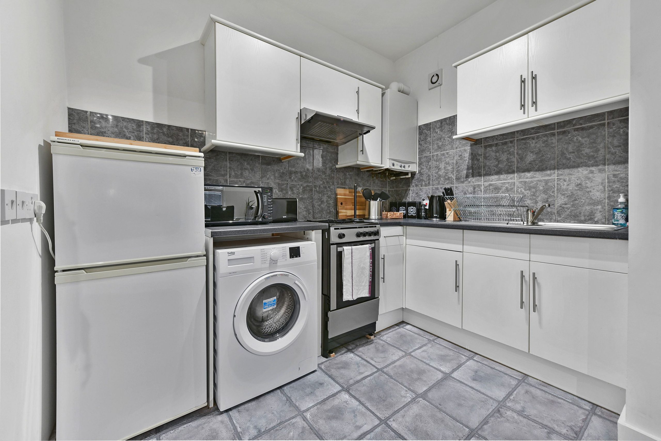 The kitchen is of course fully equipped including Fridge/Freezer, Washer, Microwave, Kettle, Toaster, etc as well as utensils, crockery etc.